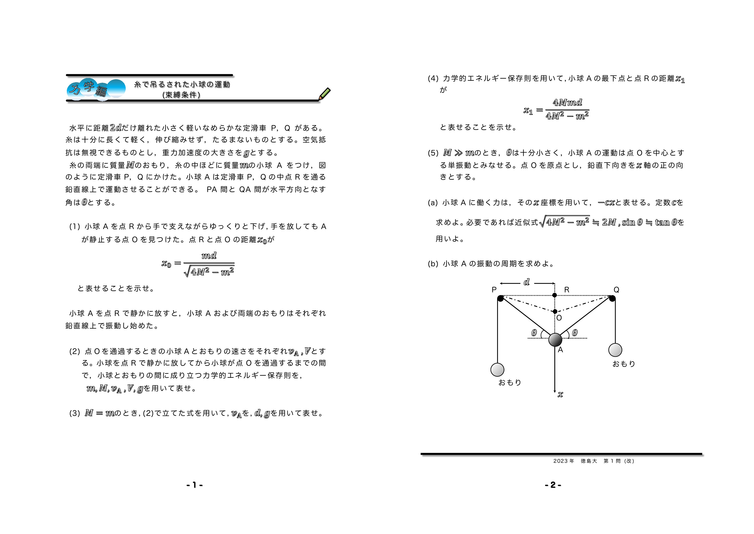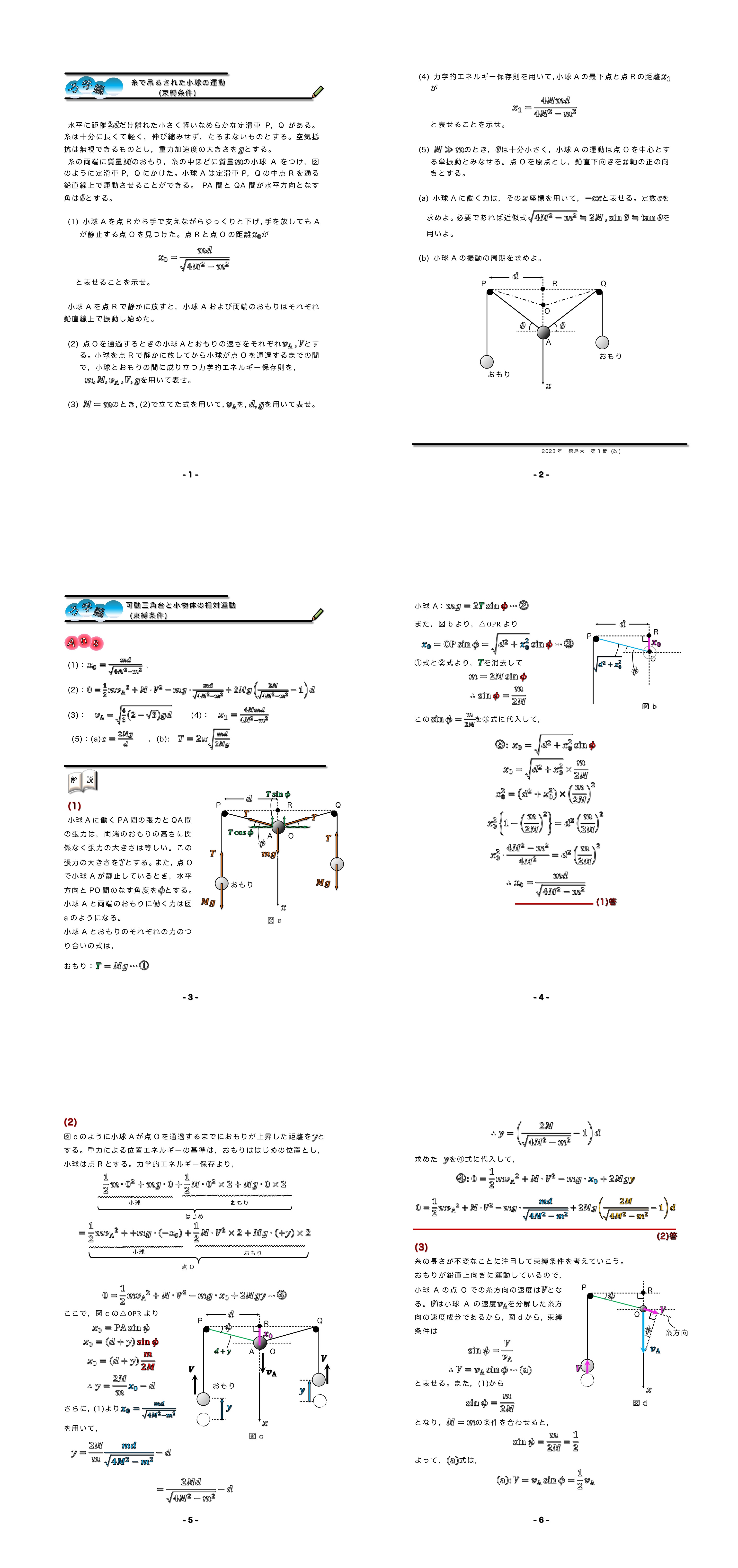 | 糸につながれた小球の運動(束縛条件) 2023年 徳島大学 第1問★★★★ |