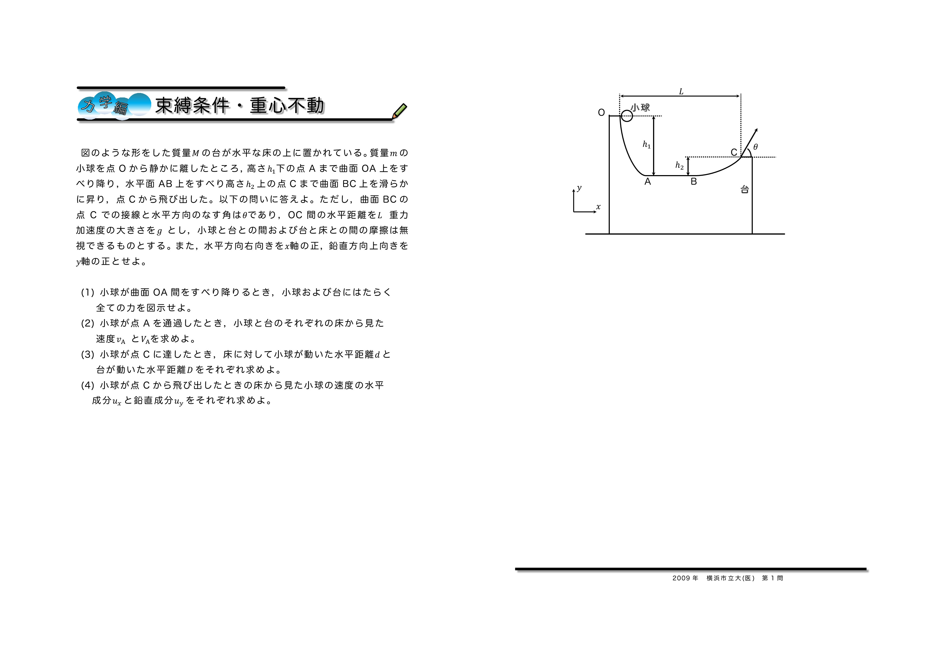 束縛条件と重心位置不変 2009年横浜市立大(医)第1問★★★★ |