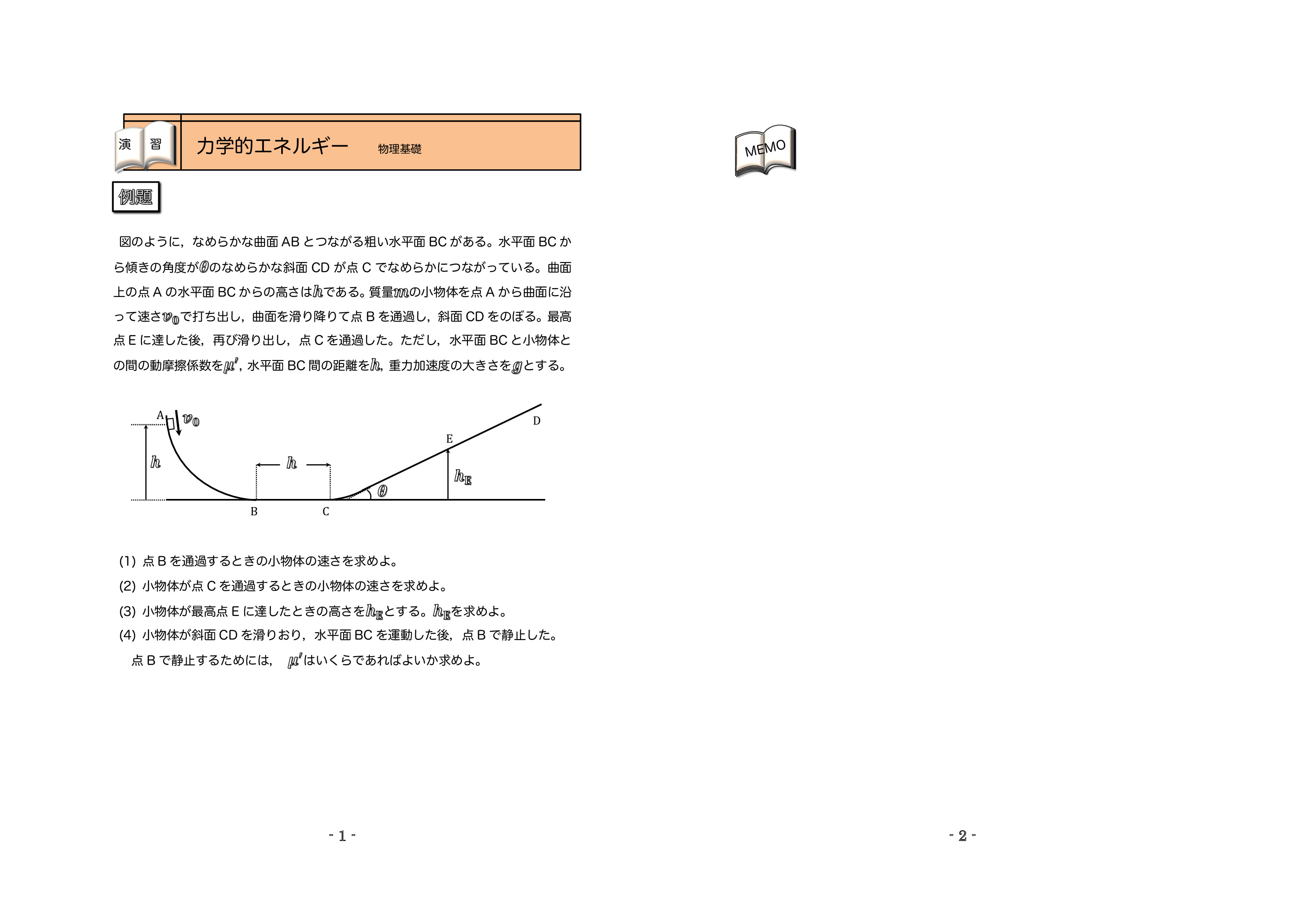 | 運動エネルギーと仕事の関係 | 例題1:力学的エネルギー保存の練習 | 例題2:仕事と力学的エネルギー(練習問題) | |||