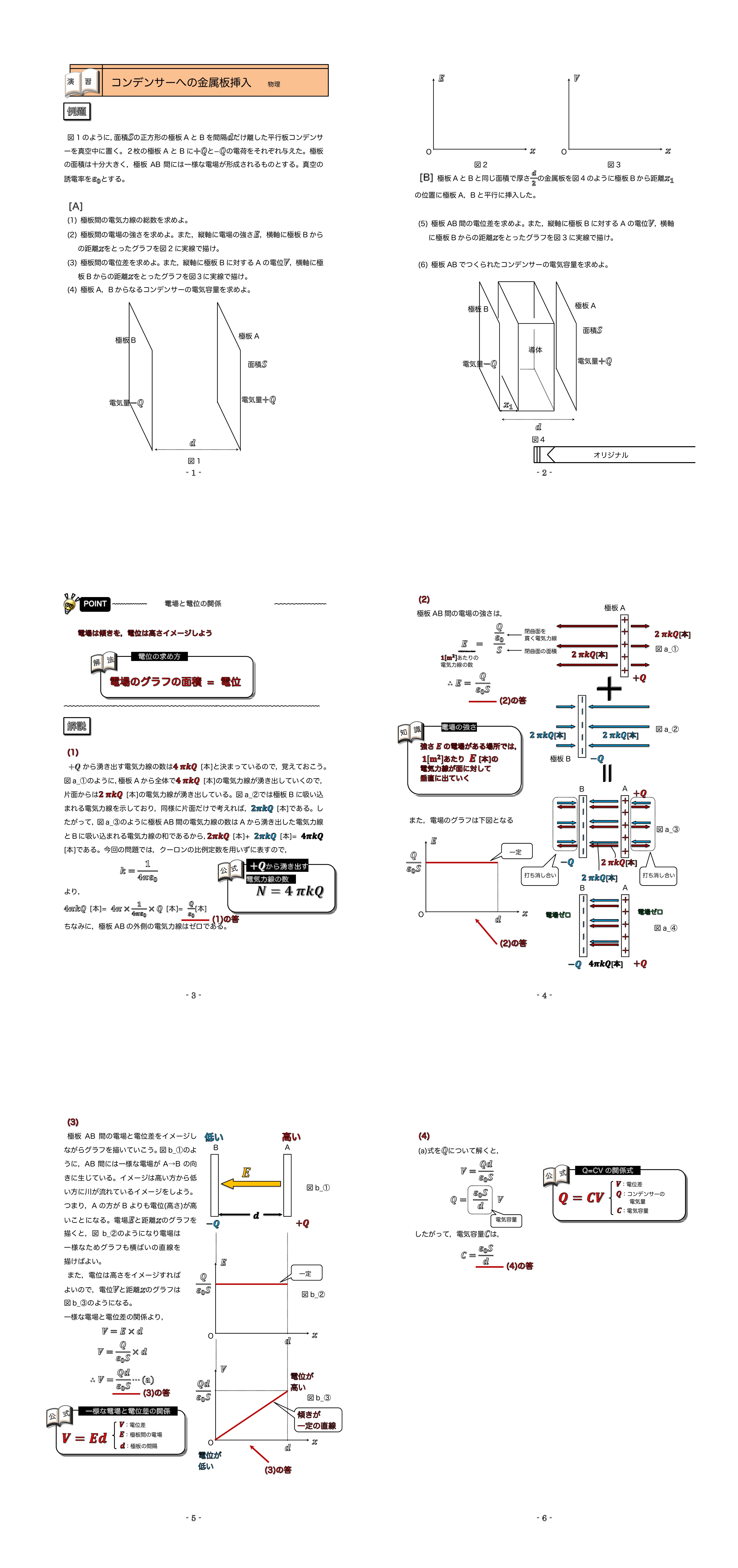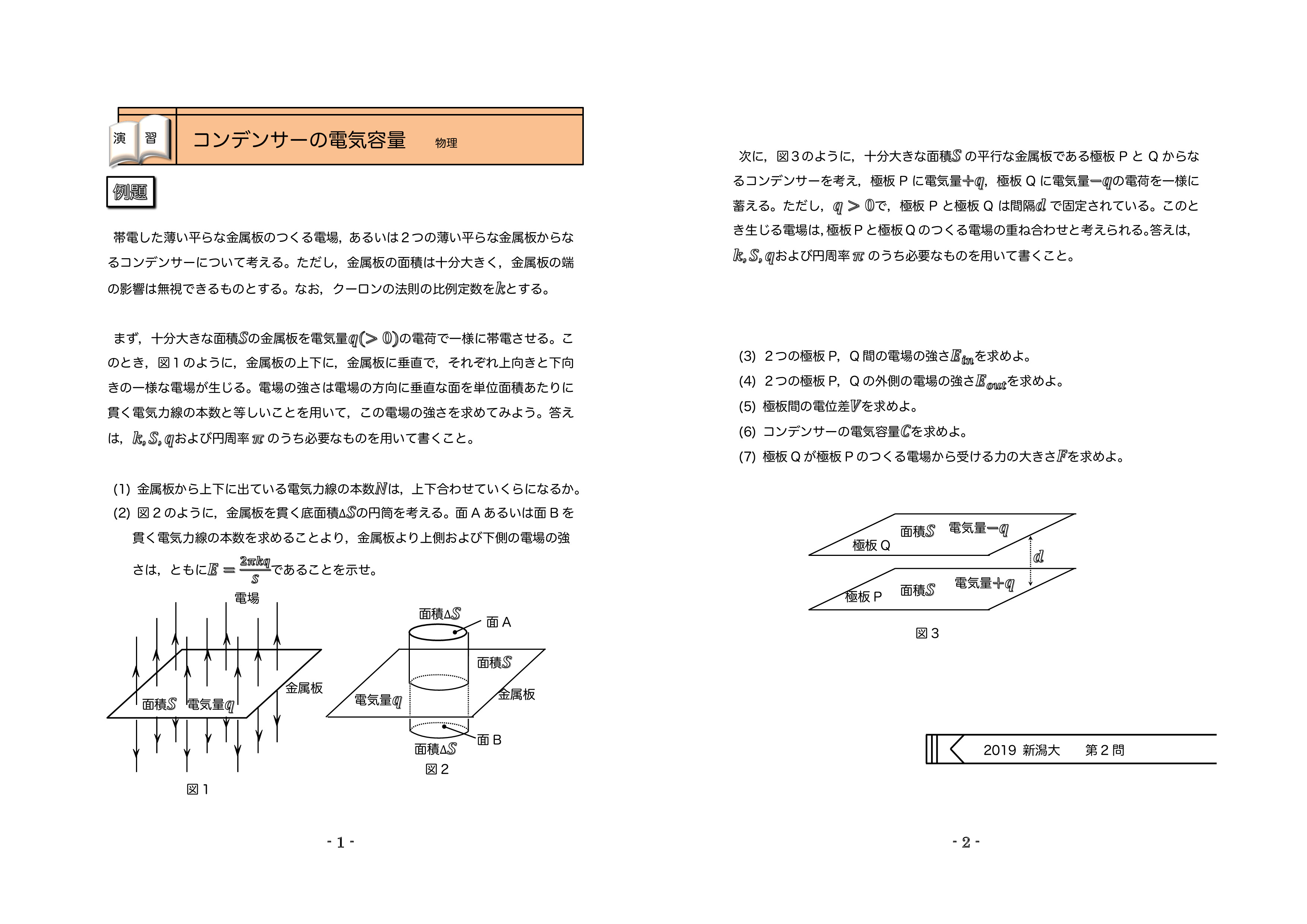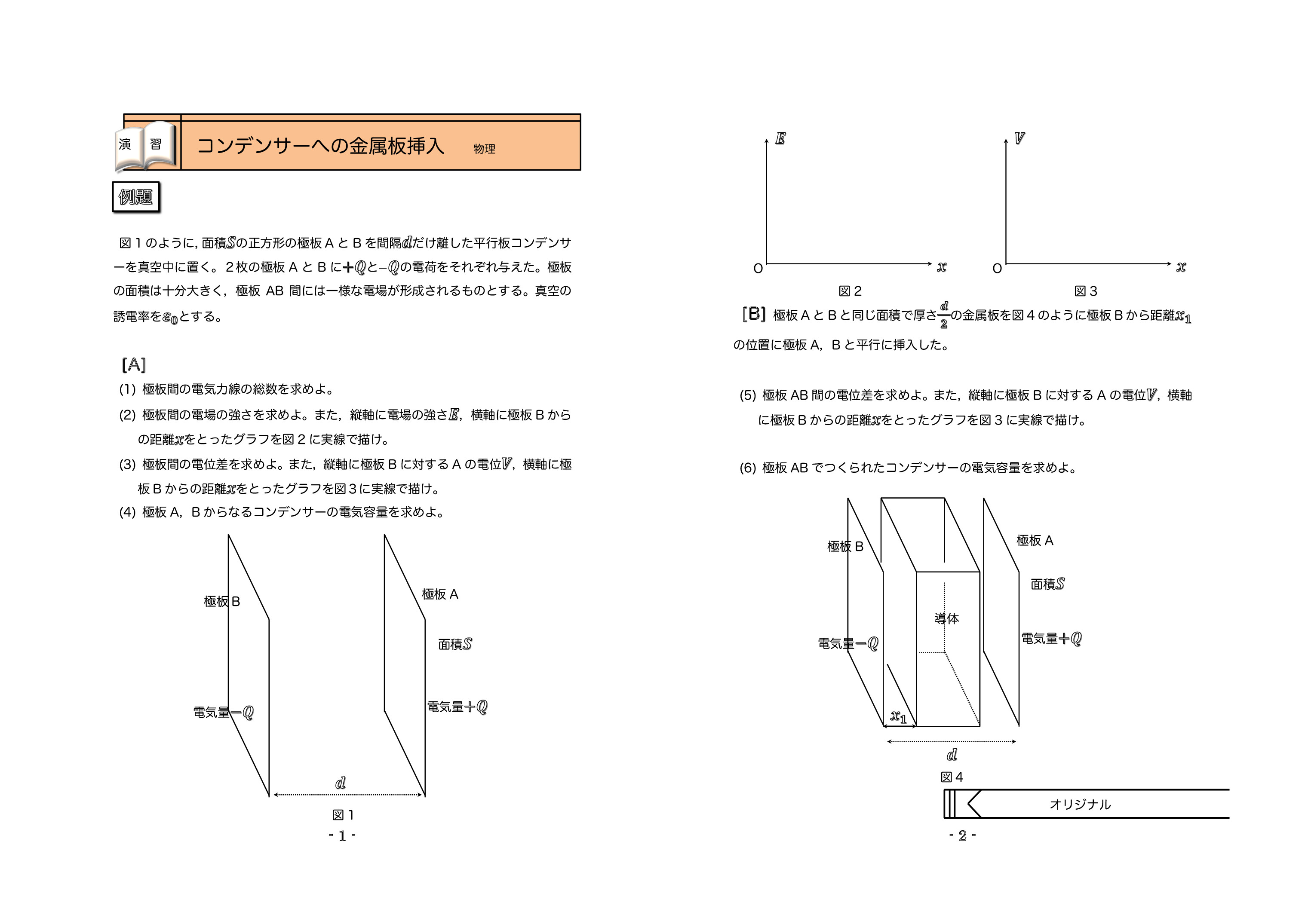 | 例題1:コンデンサーの電気容量の導出 | 例題2:コンデンサーへの金属板の挿入 | 例題3:コンデンサーへの誘電体の挿入 | |||