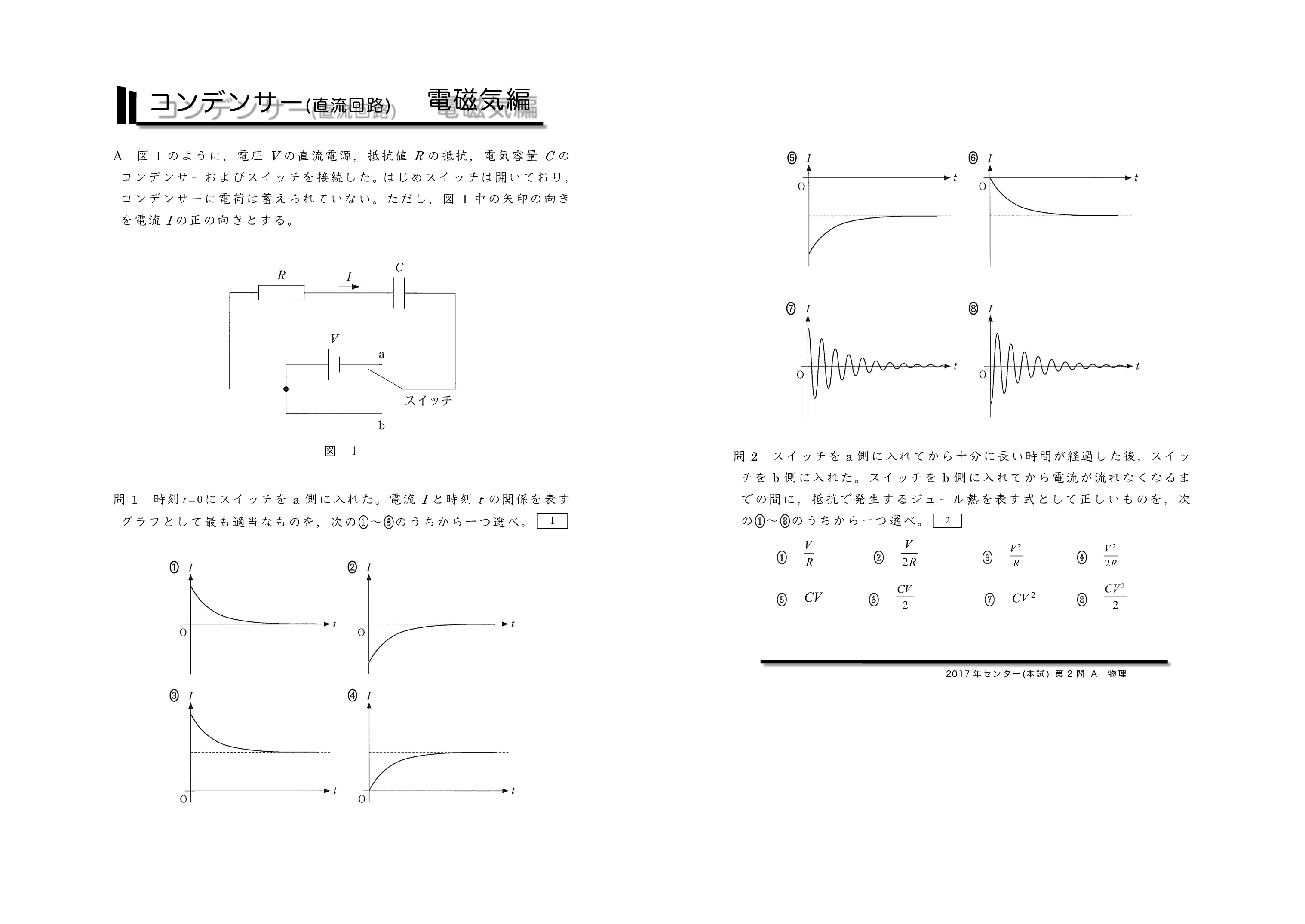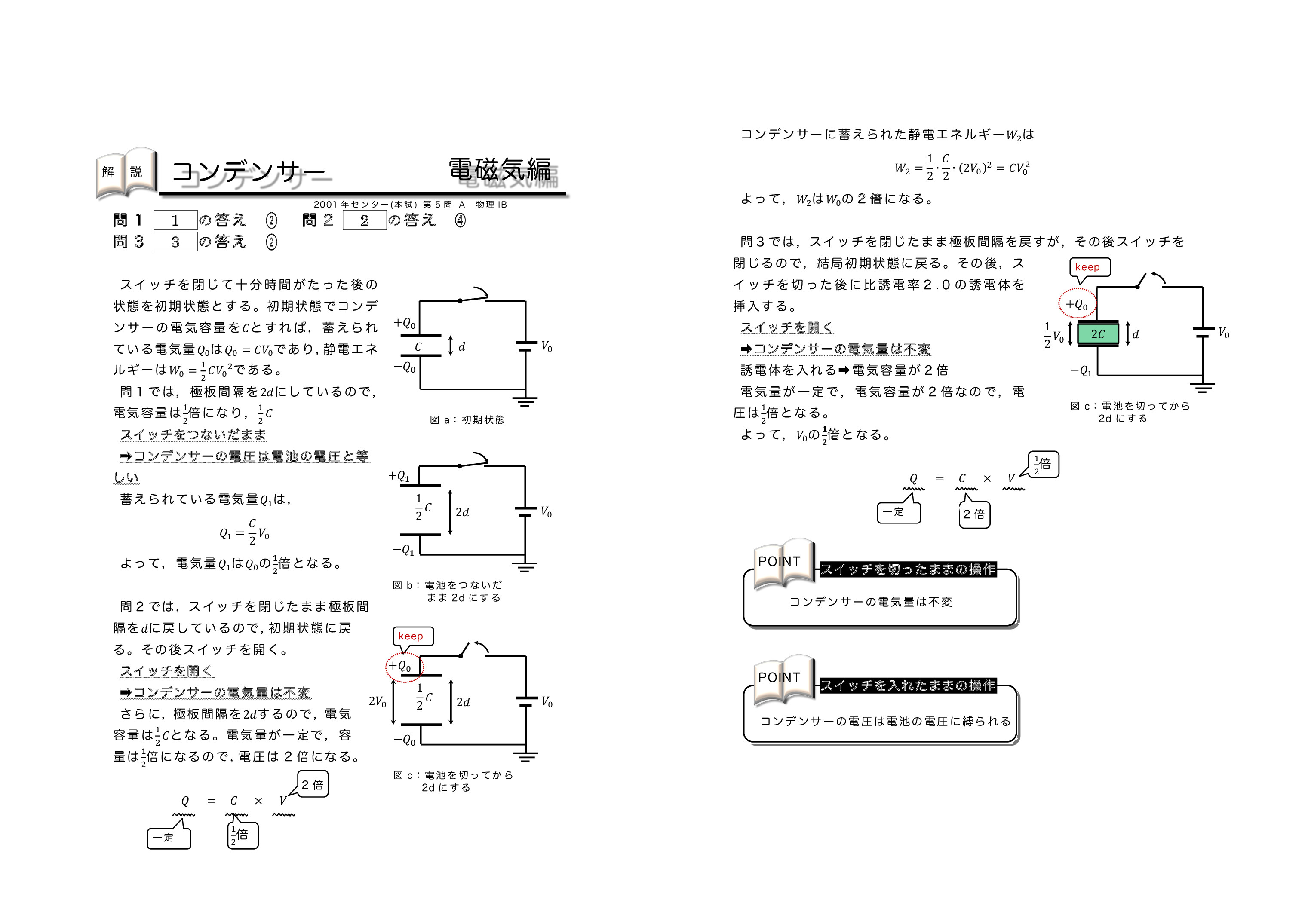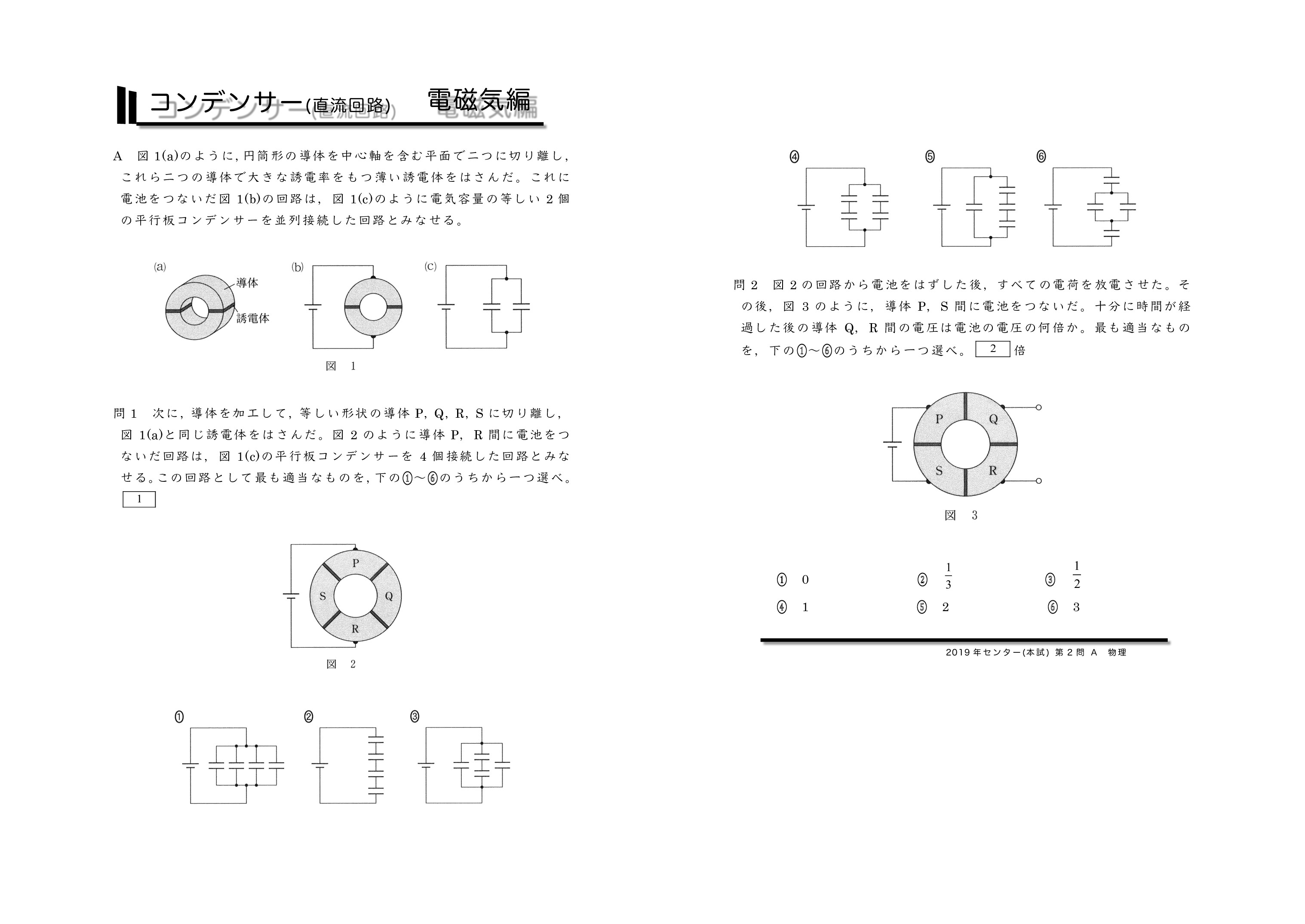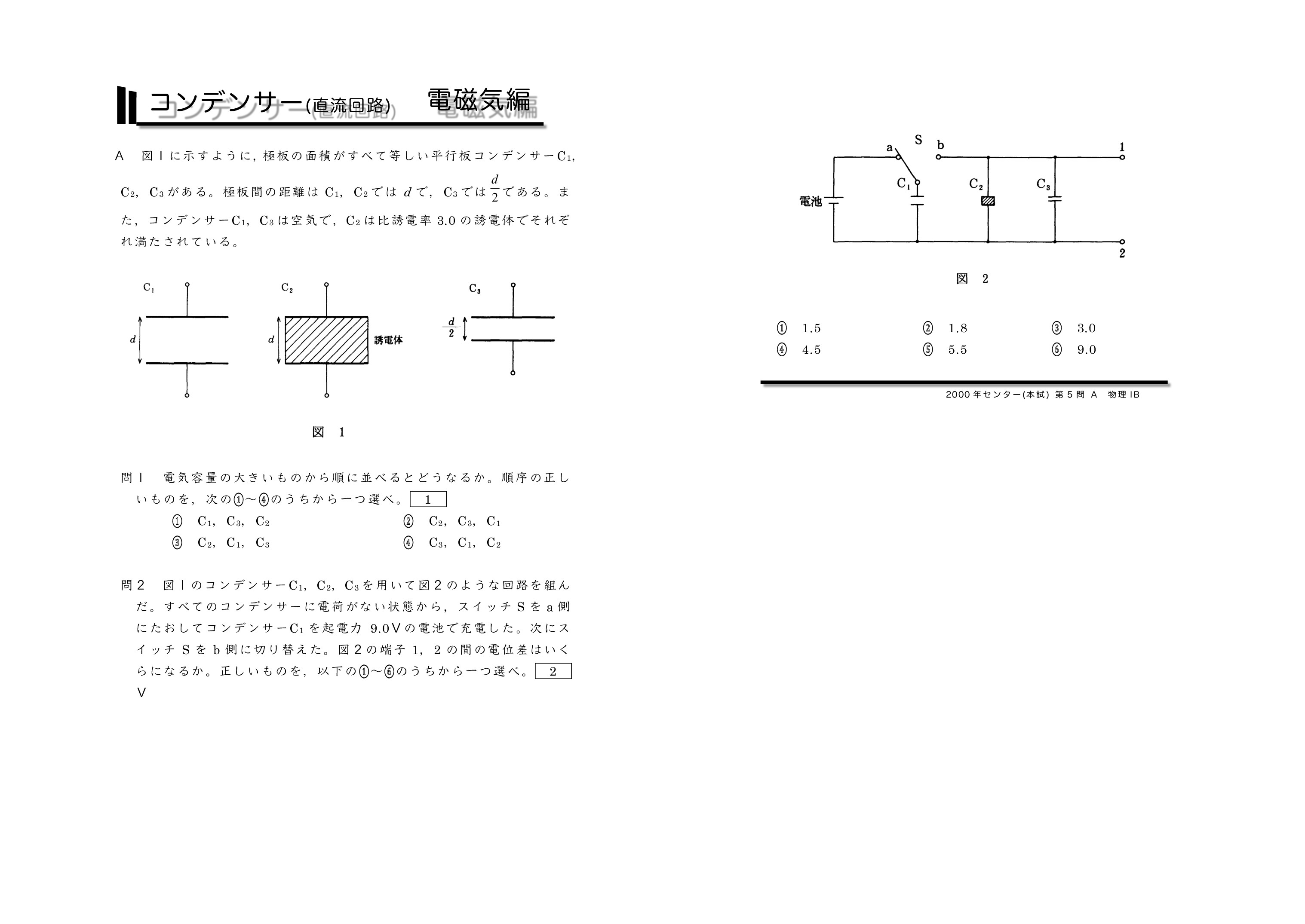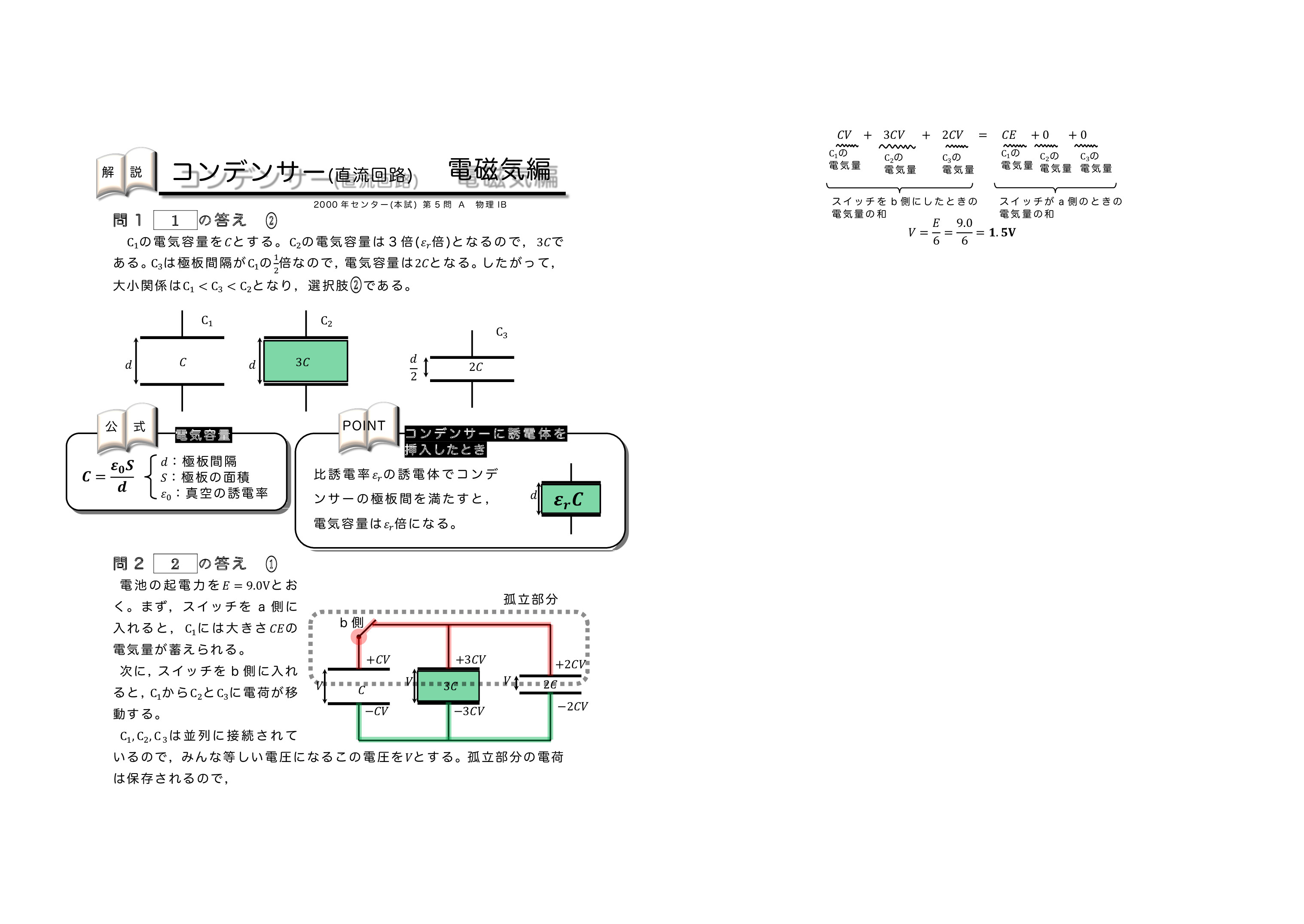| センター試験の過去問を使った共通テスト対策になります。左から右へ順にグリーン→オレンジ→ブルーの順番に問題を解いていくと学習効果が上がるように作成しています。問題を解いた後に解説ページで知識の確認をしていくとよいです。センター試験は単純なコンデンサーを含む直流回路とコンデンサー内に金属板か誘電体を入れる2タイプに分類されるよ。がんばれ♪ | ||