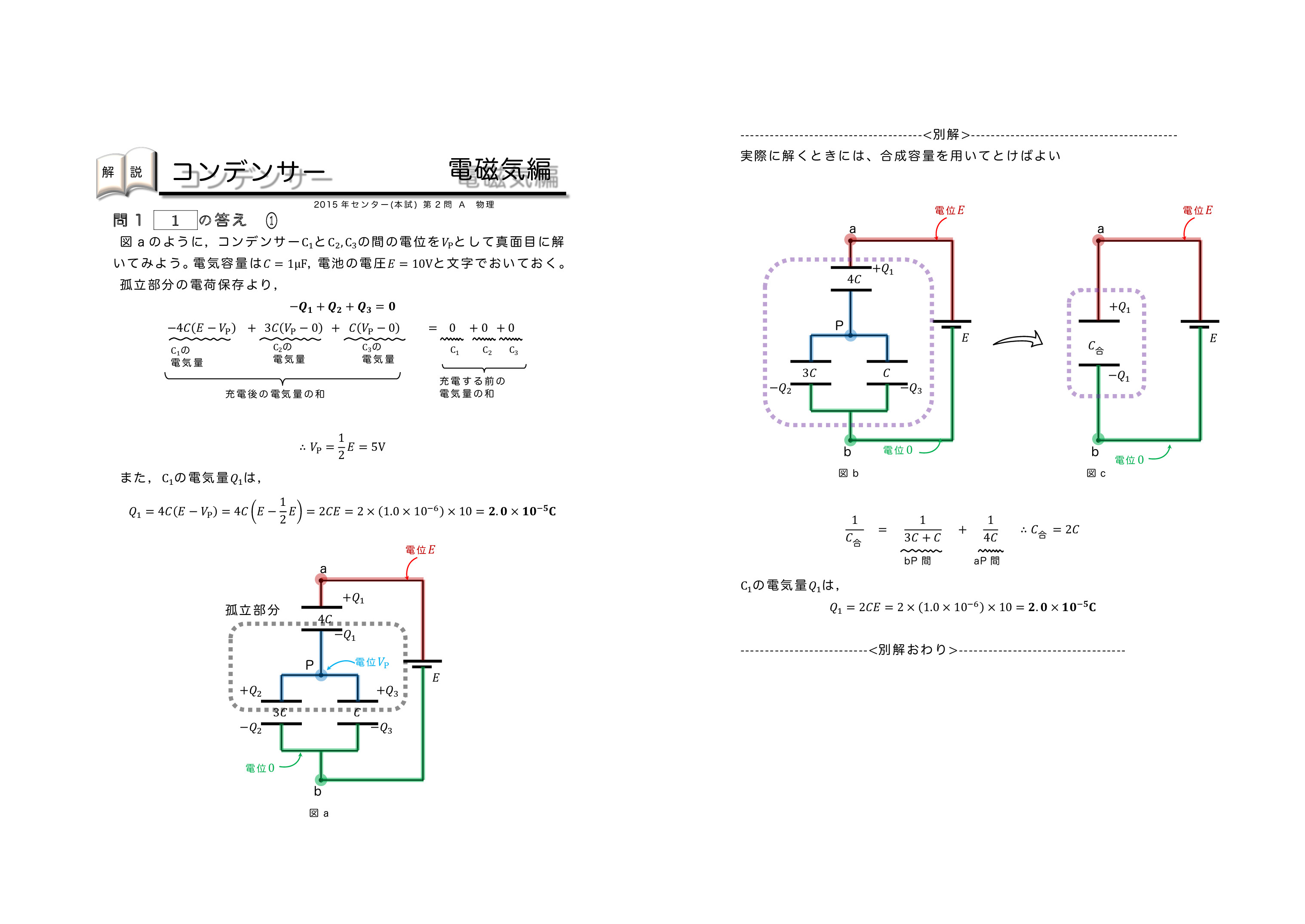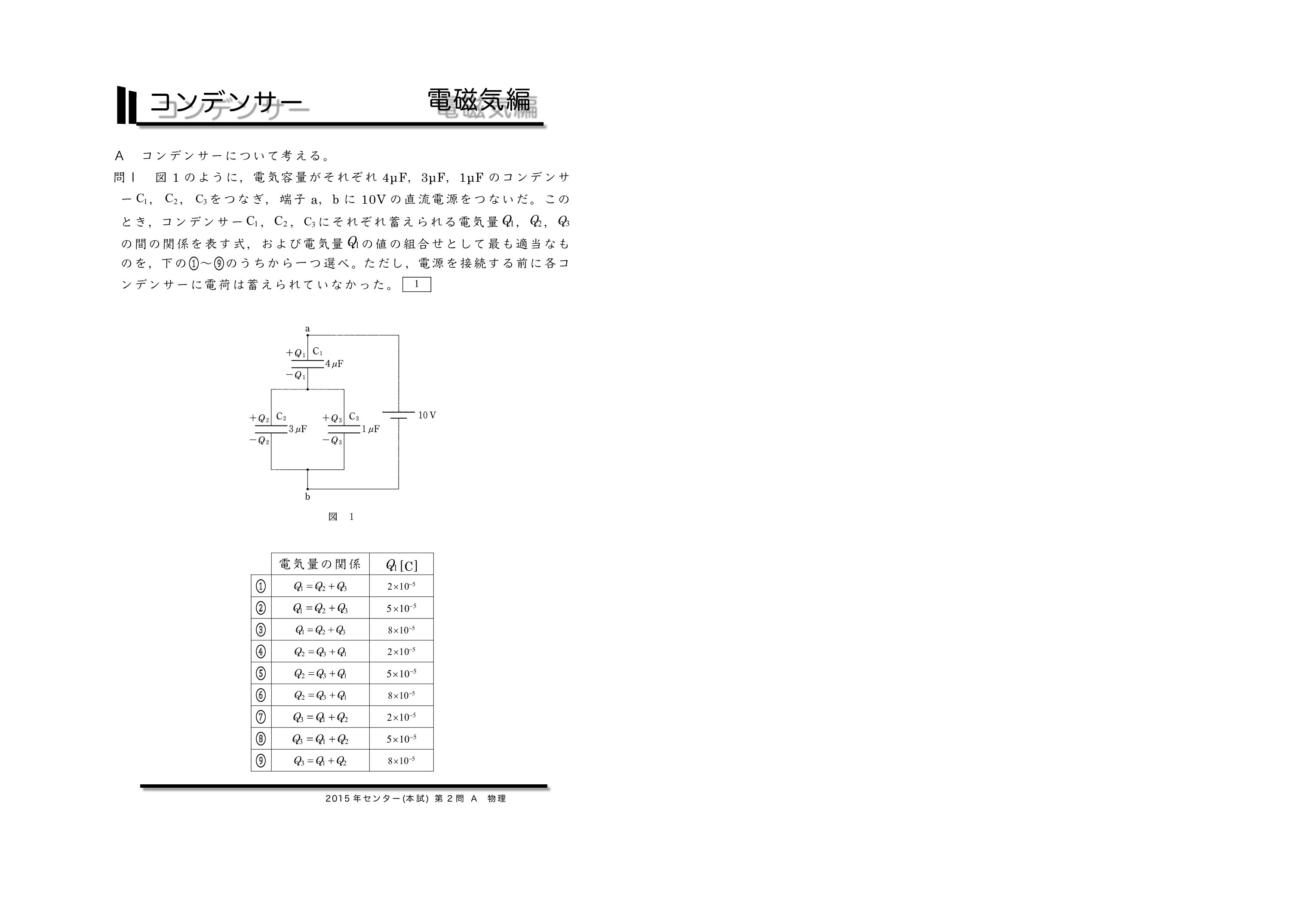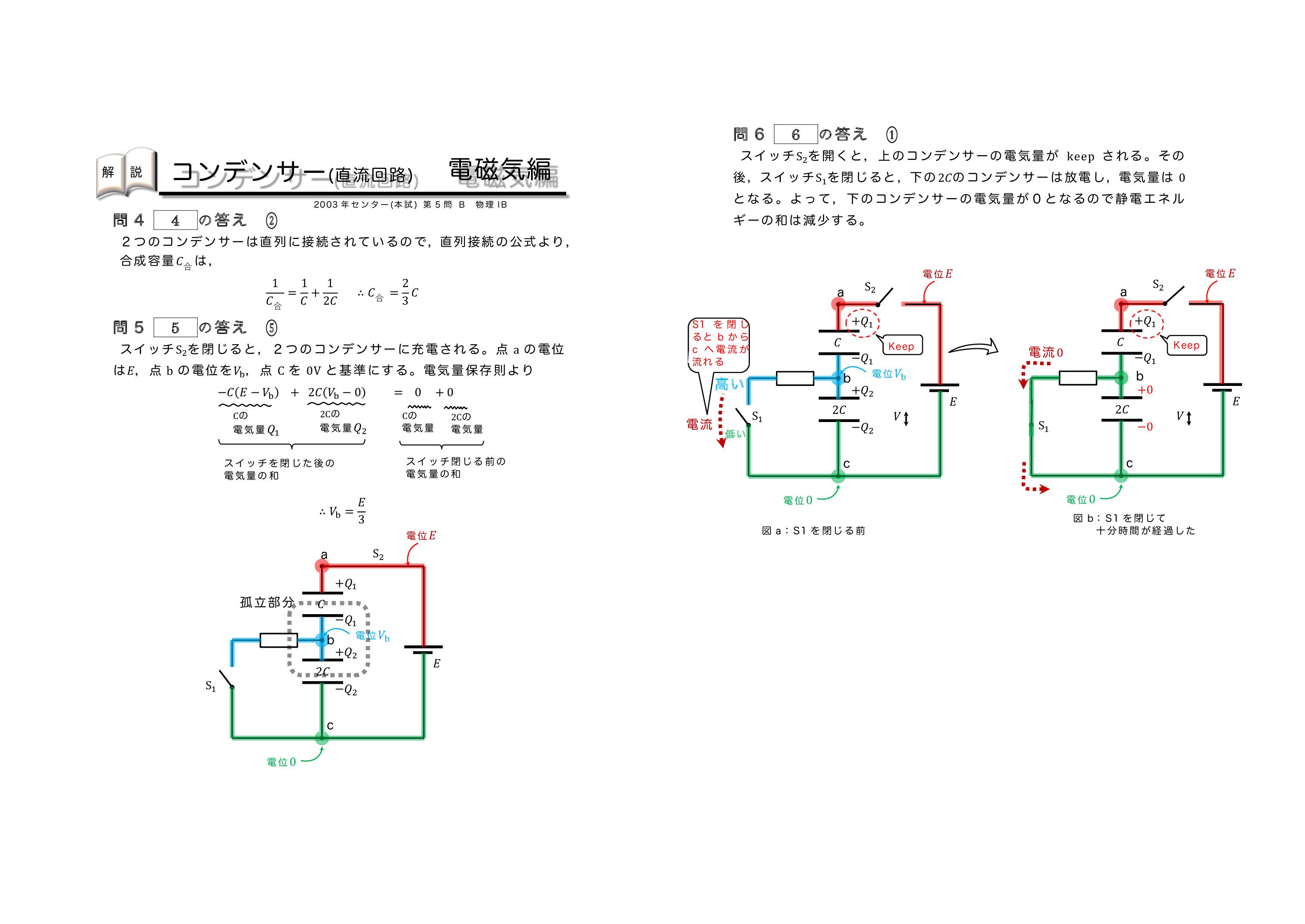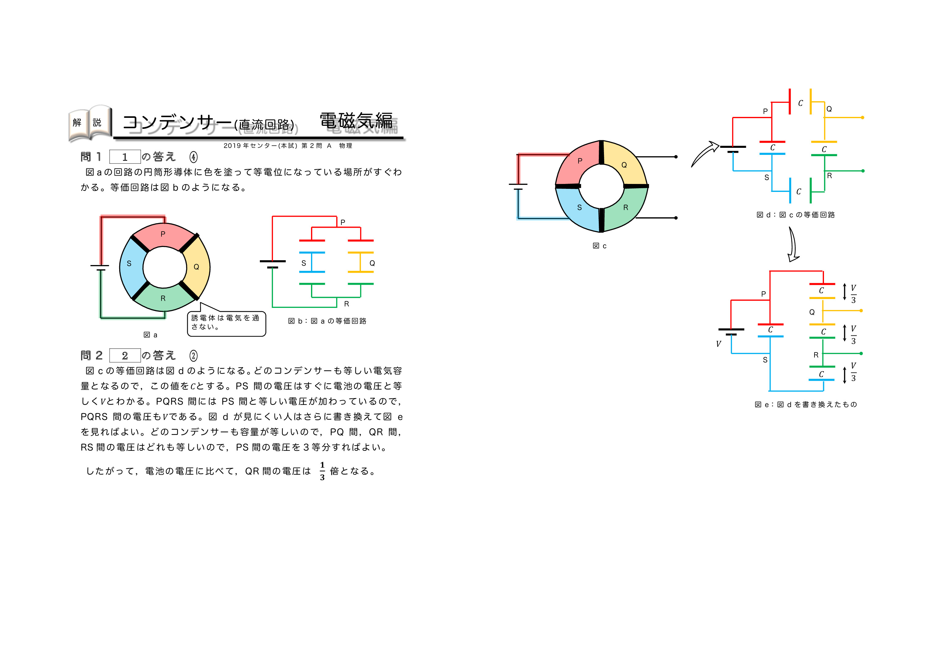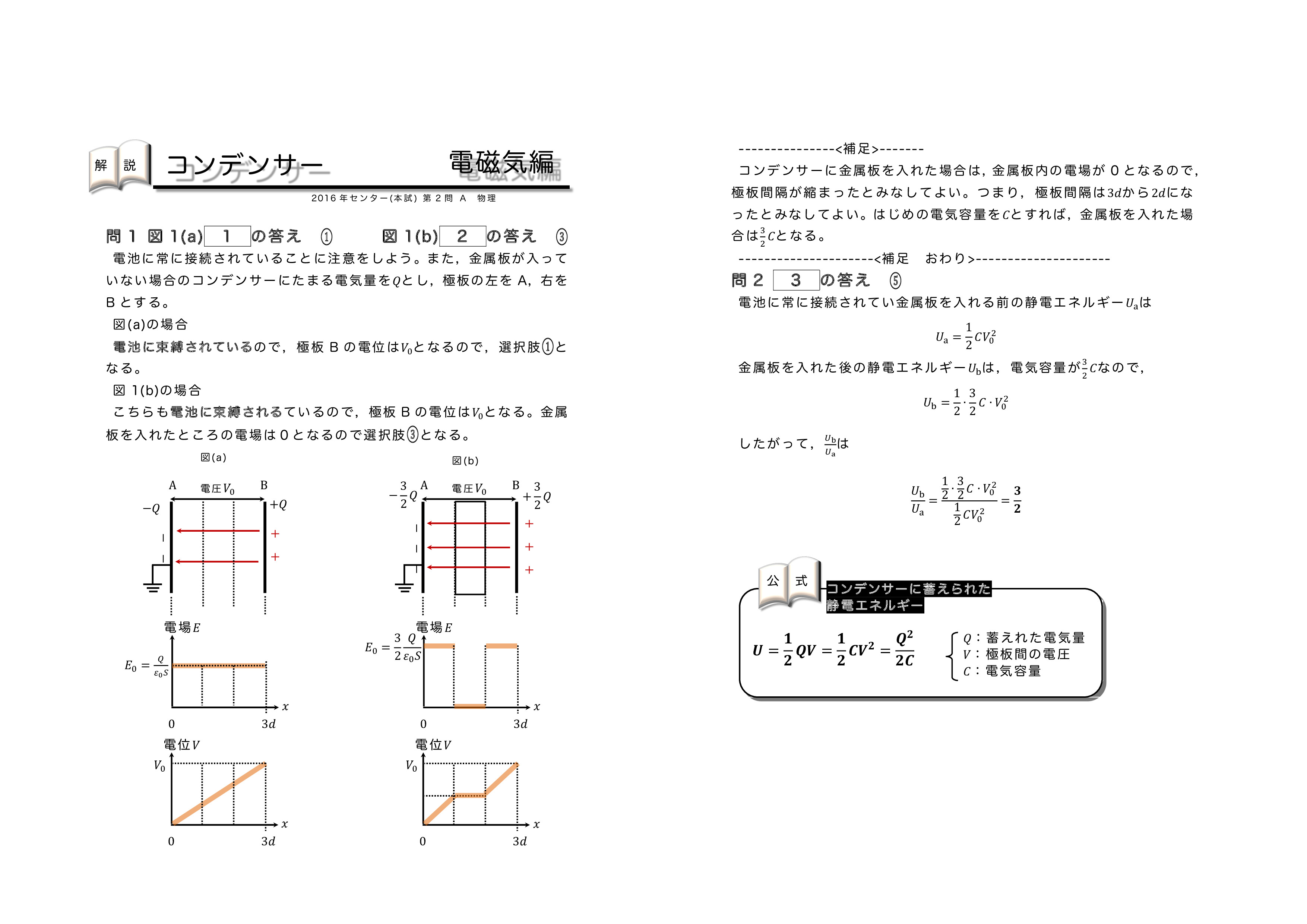 | センター試験の過去問を使った共通テスト対策になります。左から右へ順にグリーン→オレンジ→ブルーの順番に問題を解いていくと学習効果が上がるように作成しています。問題を解いた後に解説ページで知識の確認をしていくとよいです。センター試験は単純なコンデンサーを含む直流回路とコンデンサー内に金属板か誘電体を入れる2タイプに分類されるよ。がんばれ♪ | ||