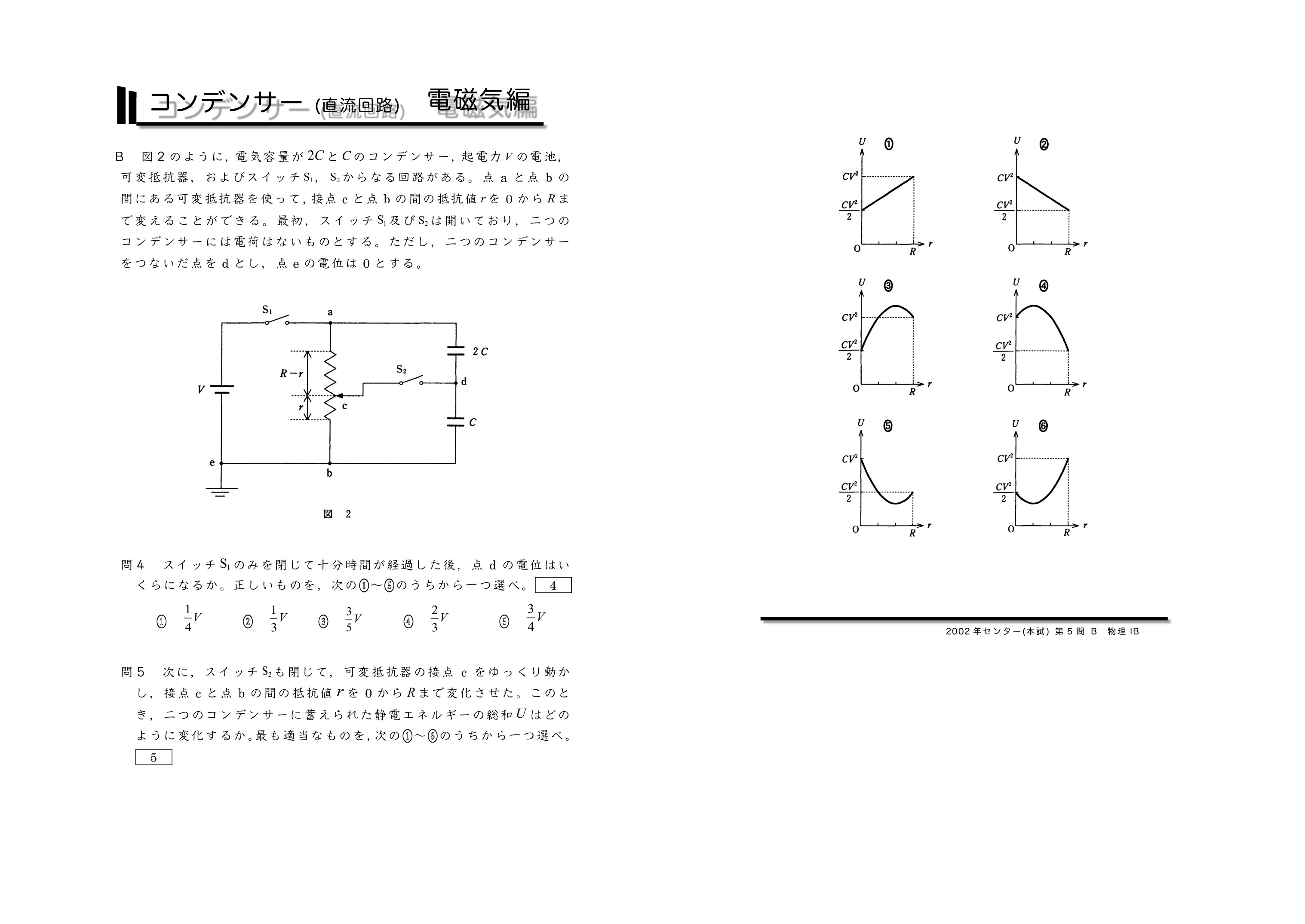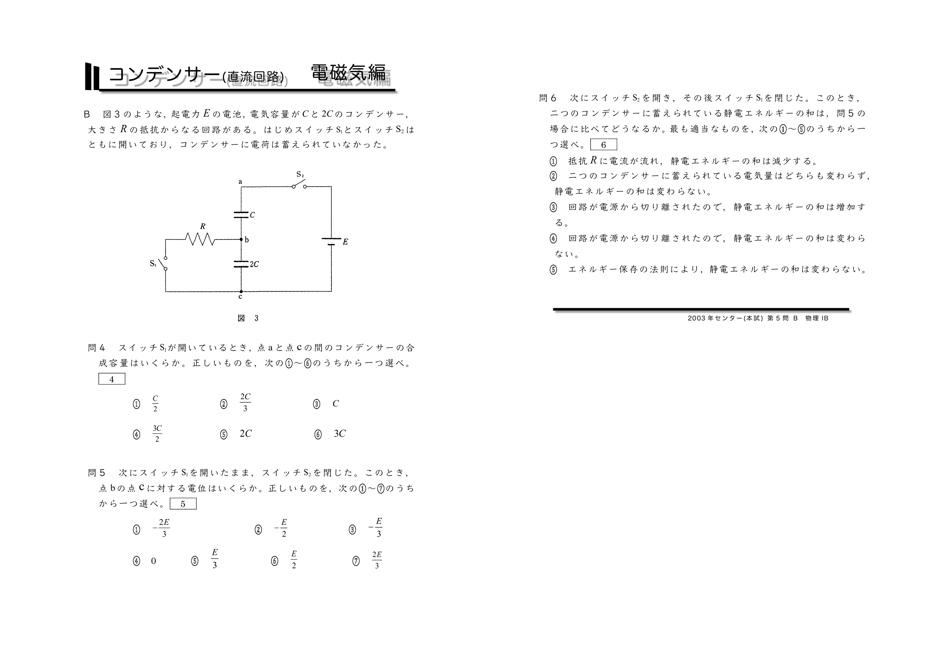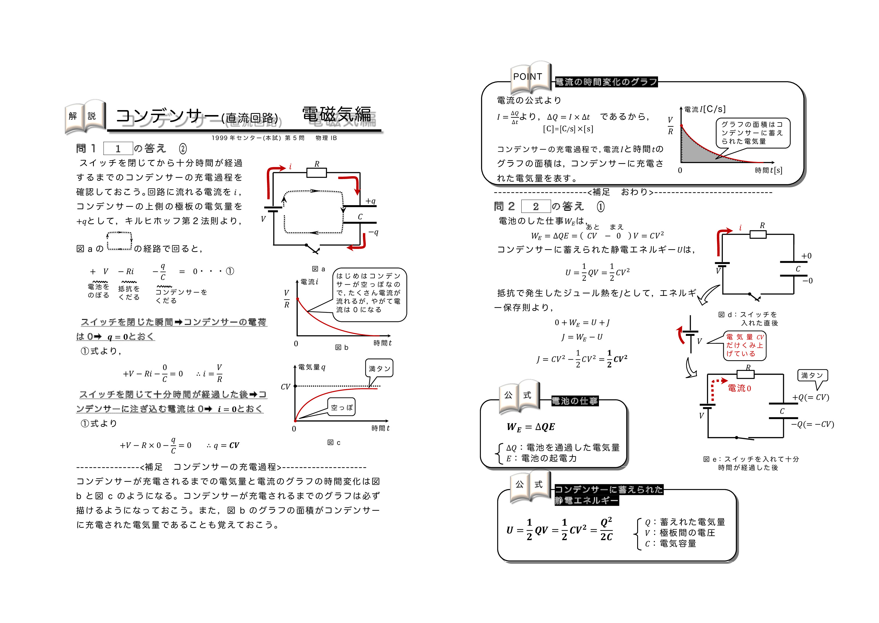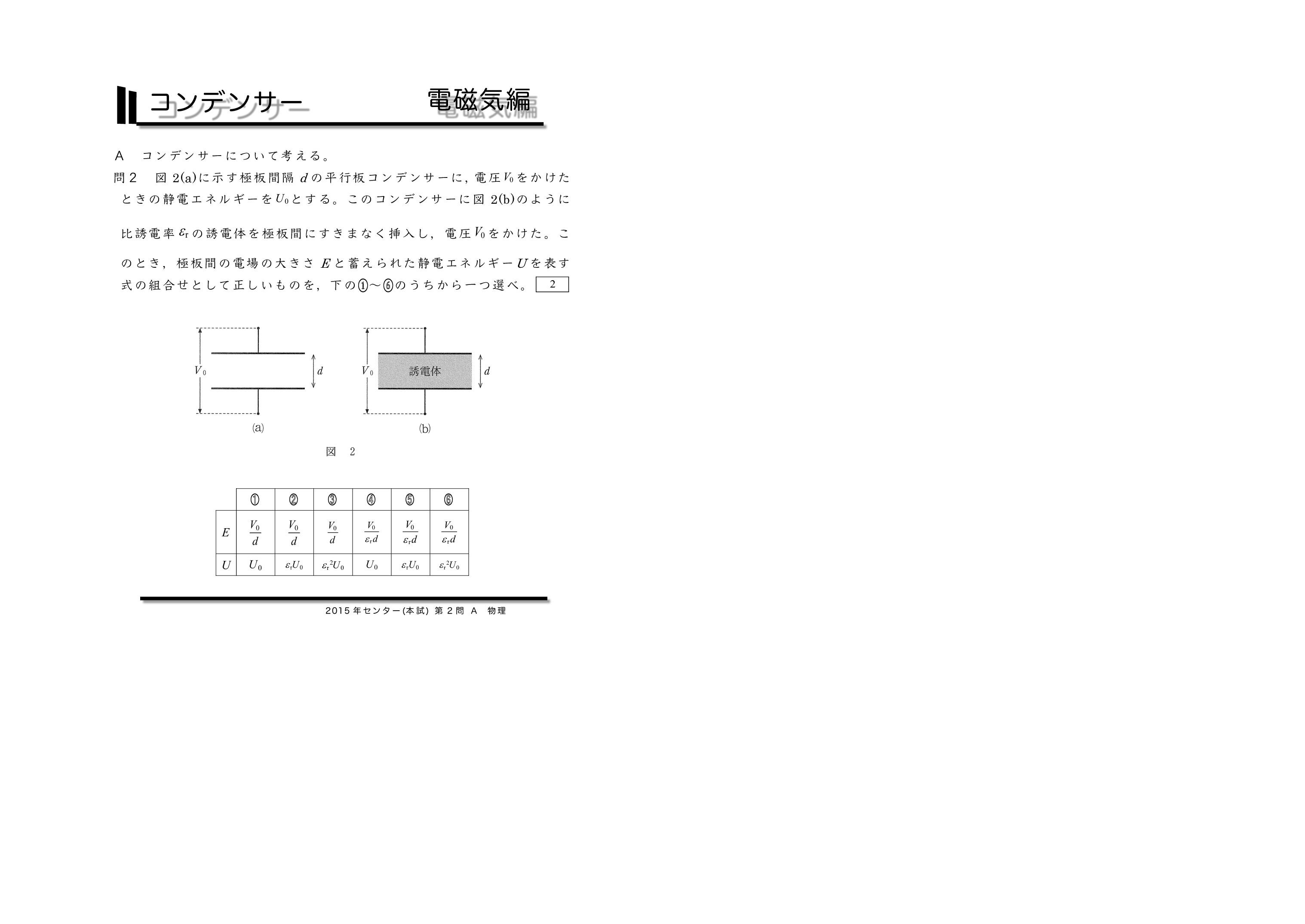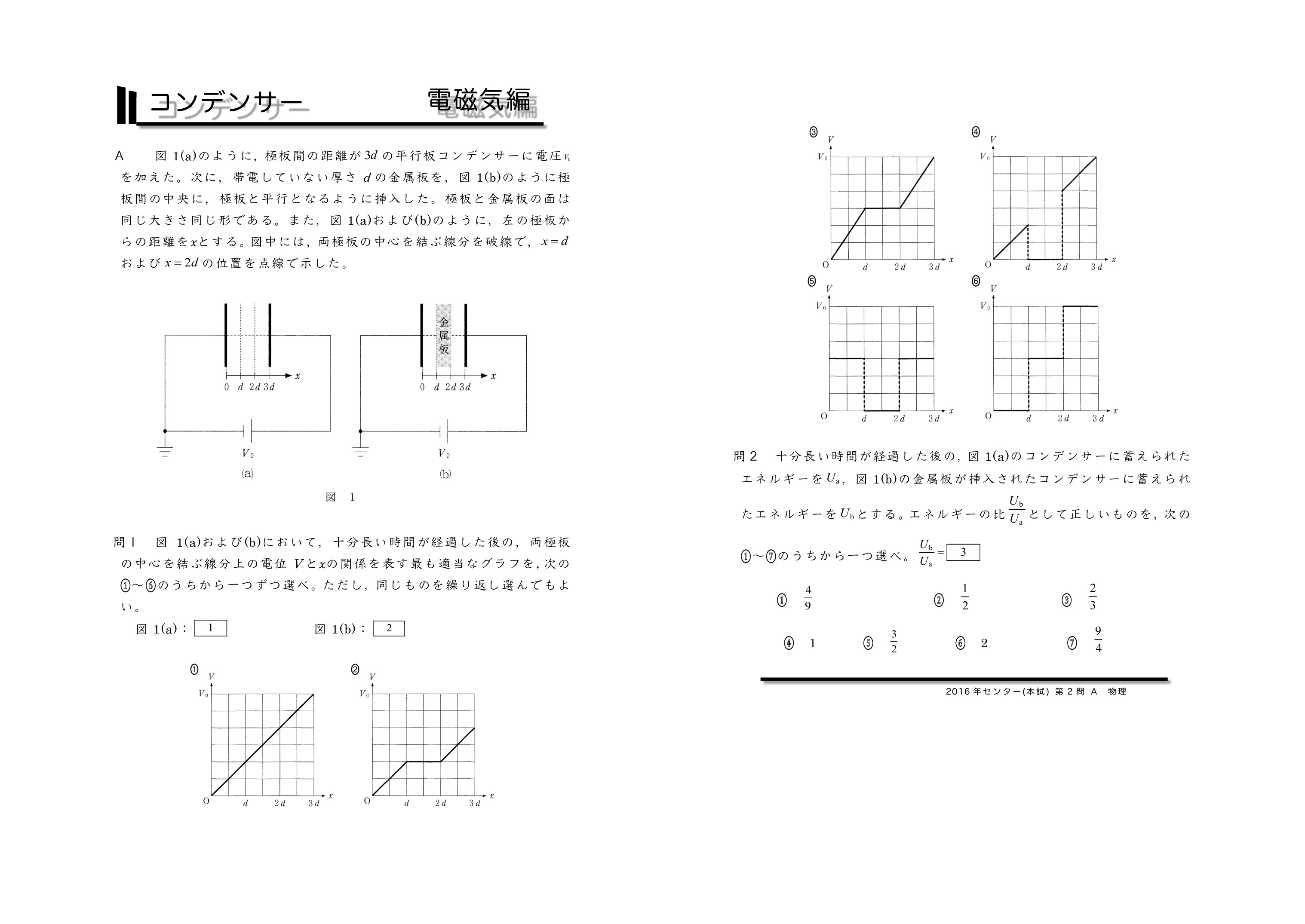 | センター試験の過去問を使った共通テスト対策になります。左から右へ順にグリーン→オレンジ→ブルーの順番に問題を解いていくと学習効果が上がるように作成しています。問題を解いた後に解説ページで知識の確認をしていくとよいです。センター試験は単純なコンデンサーを含む直流回路とコンデンサー内に金属板か誘電体を入れる2タイプに分類されるよ。がんばれ♪ | ||