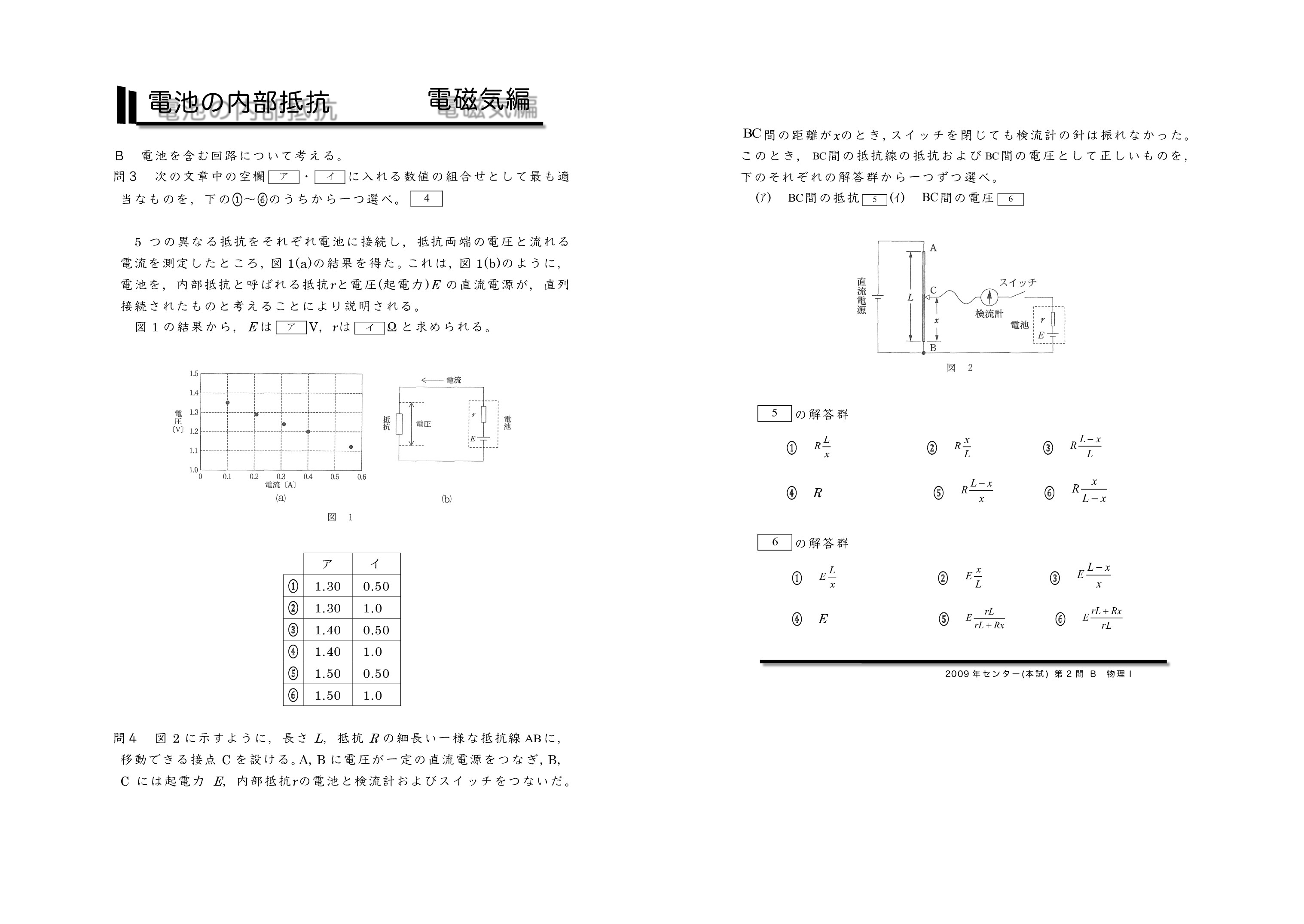 | センター試験の過去問を使った共通テスト対策になります。左から右へ順にグリーン→オレンジ→ブルーの順番に問題を解いていくと学習効果が上がるように作成しています。問題を解いた後に解説ページで知識の確認をしていくとよいです。抵抗率や電位差計が勉強できます。がんばれ♪ | ||