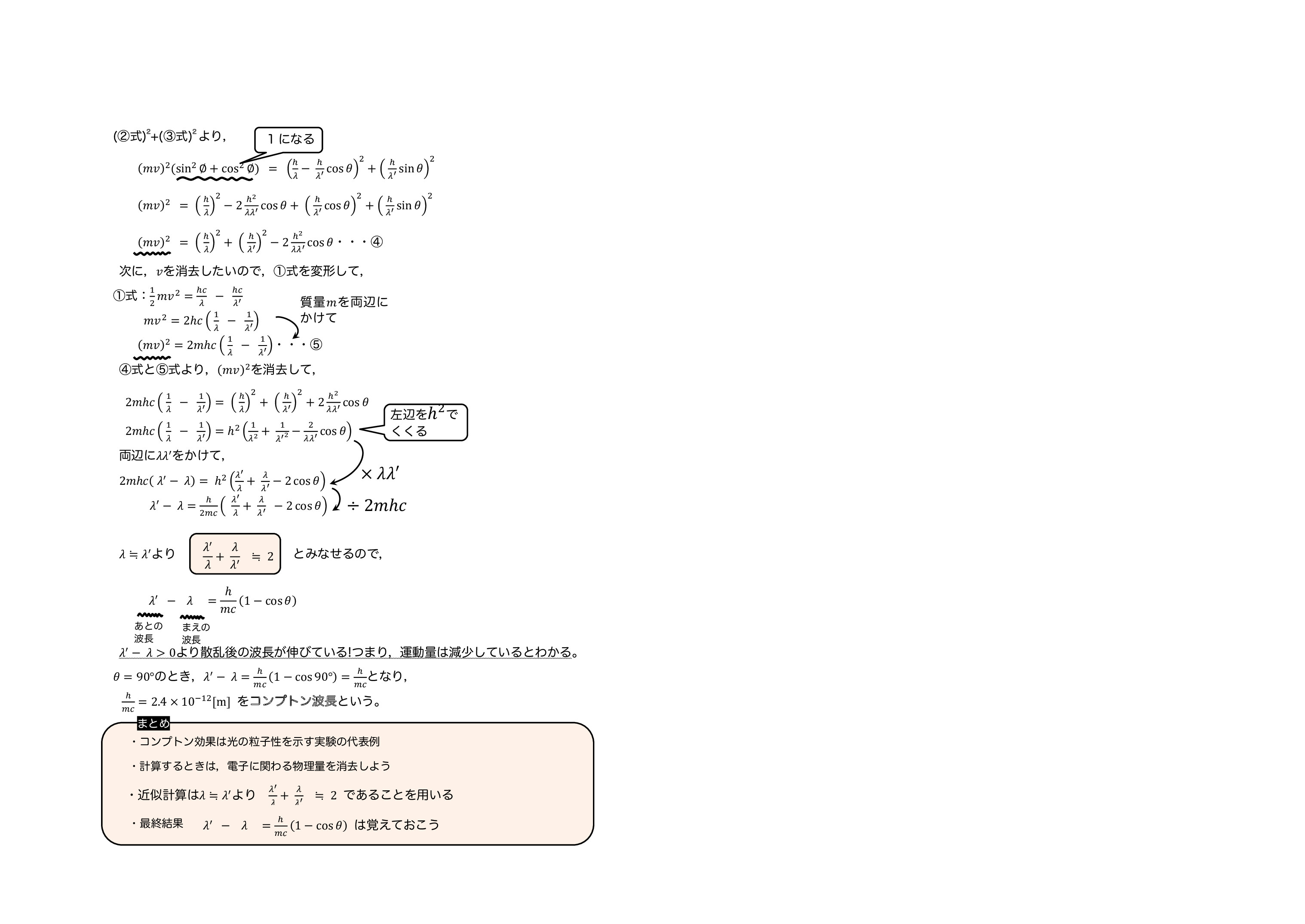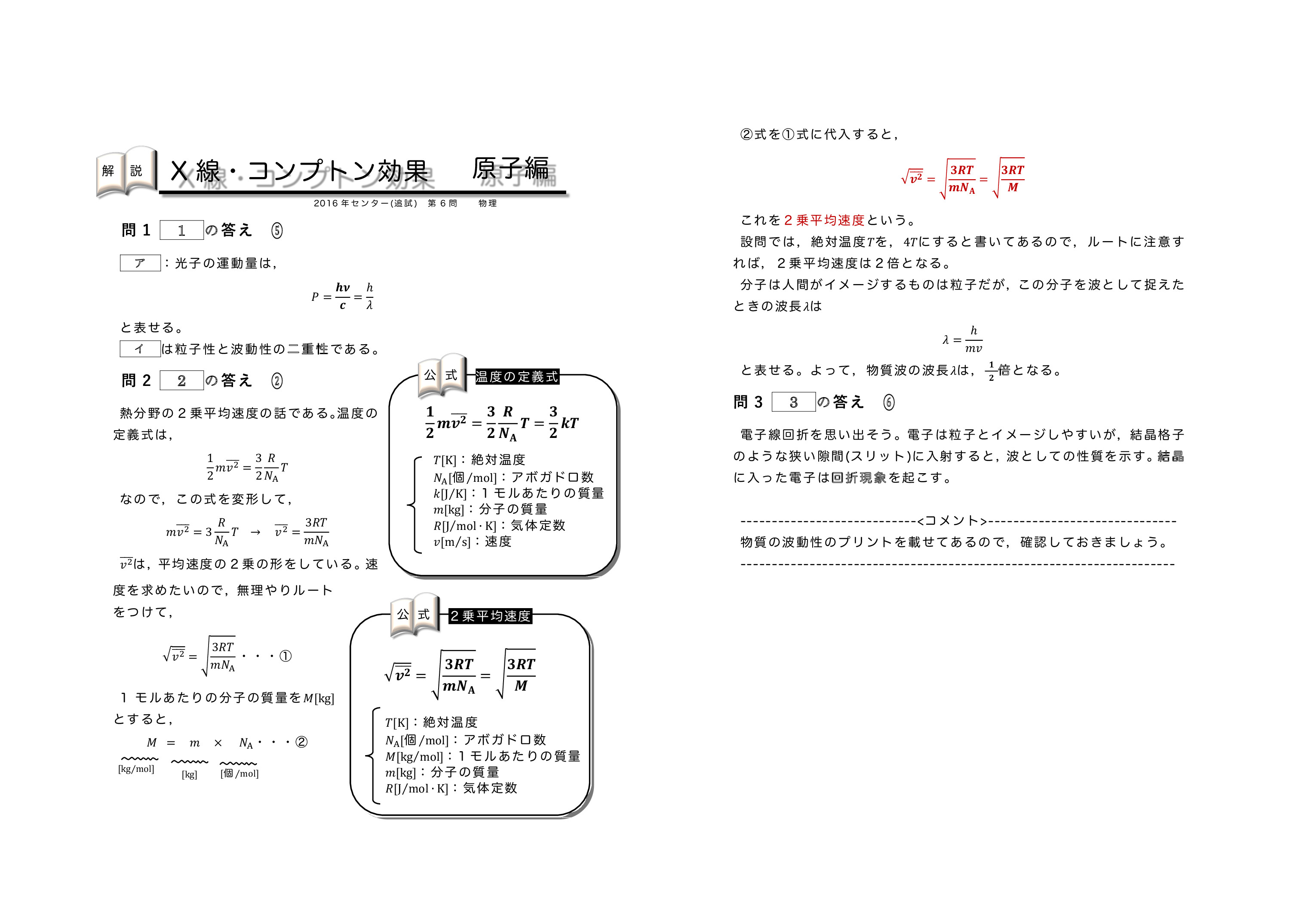 | コンプトン効果(散乱)の解説プリントになります。 コンプトン効果を忘れてしまった人は 確認しておいてください。 レクチャー①はこちら レクチャー②はこちら | 物質波の解説プリントになります。 物質波を忘れてしまった人は確認しておいてください。 レクチャーはこちら | X線の解説プリントになります。 X線を忘れてしまった人は確認しておいてください。 グリーン生はテキストにX線が入っていなかったので, 講義はしていないです。 グリーン生はX線の解説は読んでおいた方がいいよ。 レクチャー①はこちら レクチャー②はこちら |