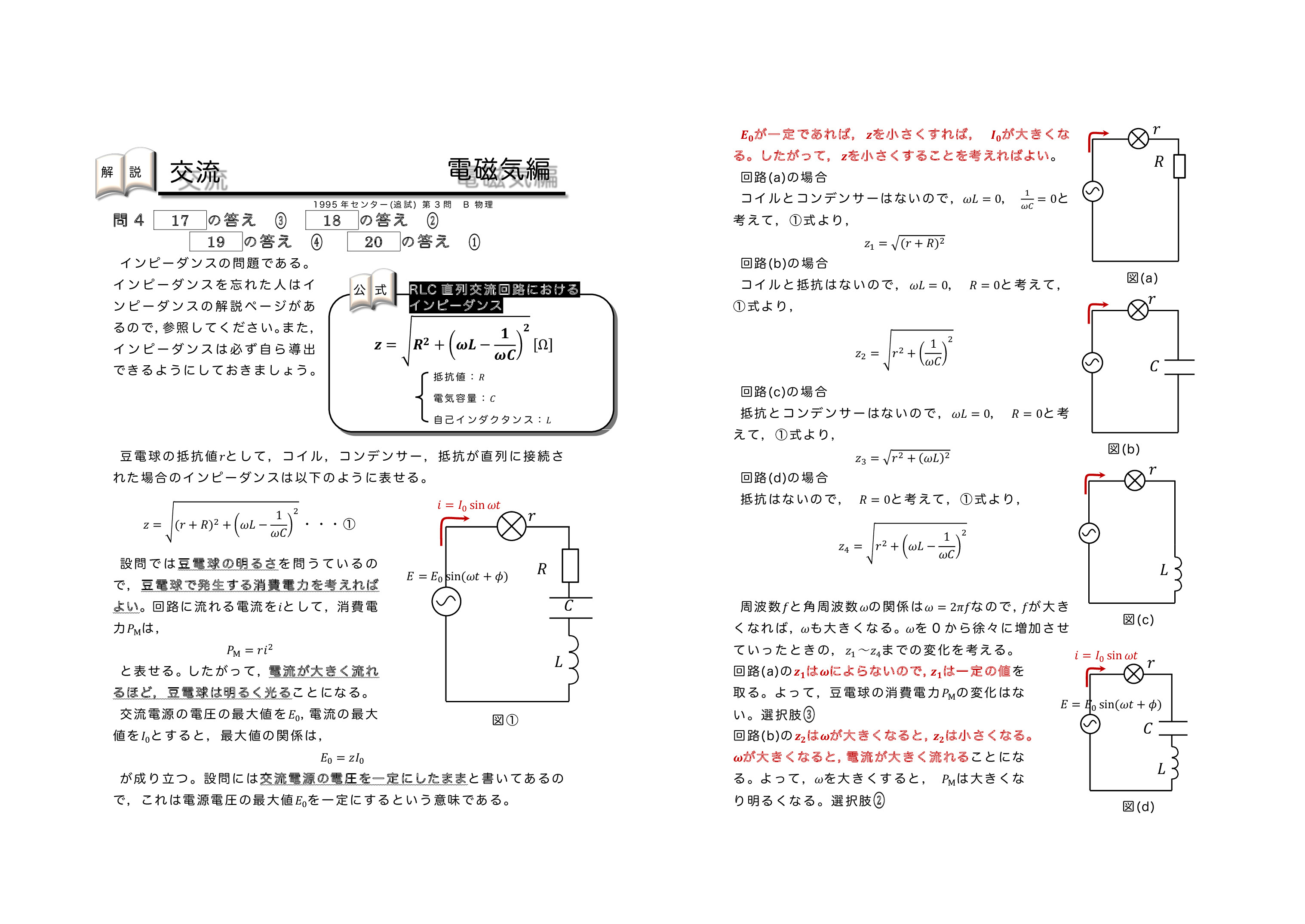 解答1ページ目はこちら 解答2ページ目はこちら 参考としてリアクタンスを載せておきます。忘れた人は確認しておいてください。リアクタンス1ページ目はこちら リアクタンス2ページ目はこちら 参考としてインピーダンスの導出を載せておきます。忘れた人は確認しておいてください。インピーダンスはこちら | ↓下の画像をクリックすれば見れます