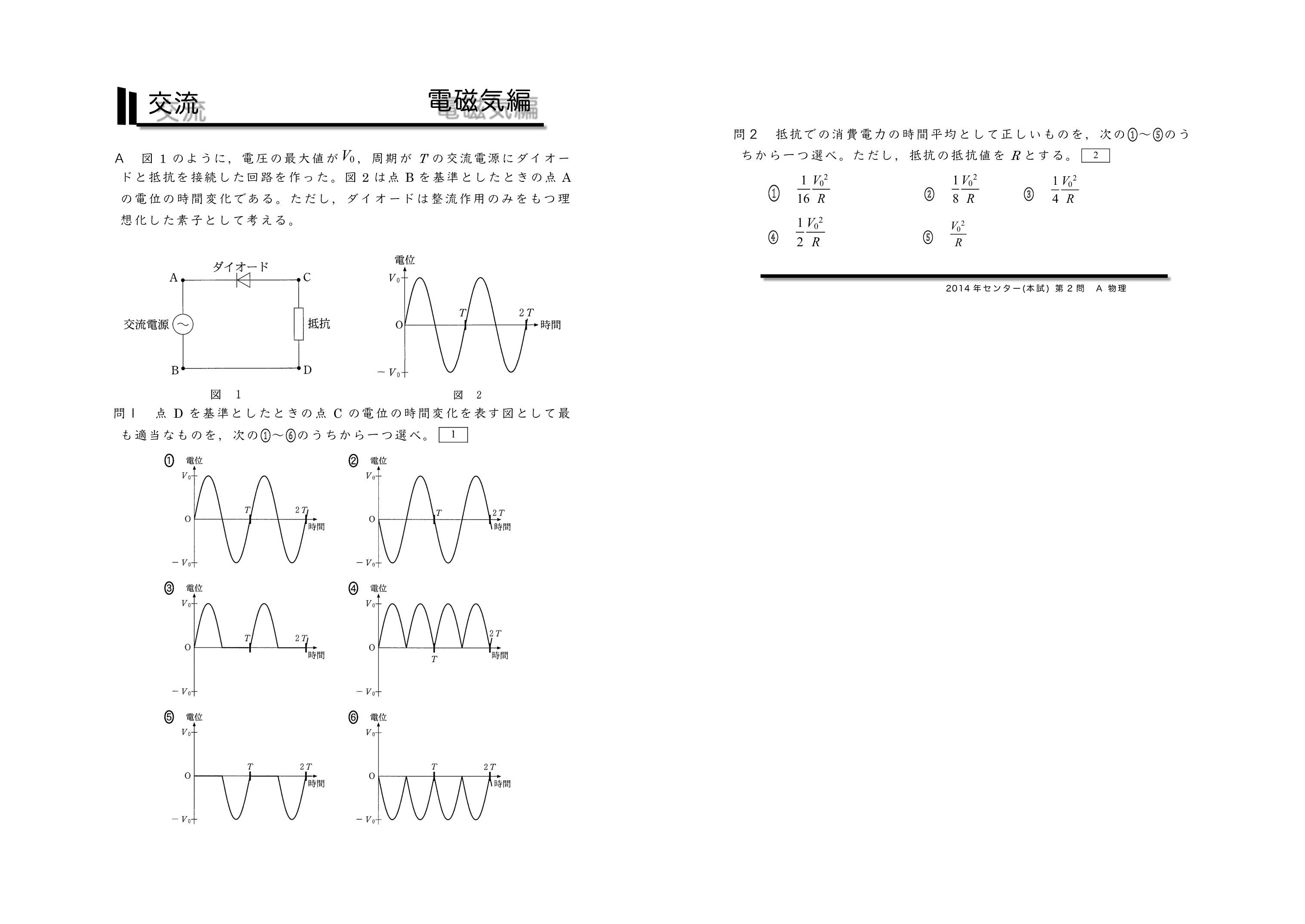| センター試験の過去問を使った共通テスト対策になります。左から右へ順にグリーン→オレンジ→ブルーの順番に問題を解いていくと学習効果が上がるように作成しています。問題を解いた後に解説ページで知識の確認をしていくとよいです。交流は勉強が遅れがちなテーマなのでしっかり勉強しておこうね。交流が出たときにドキってしないようにねー。がんばれ♪ | ||