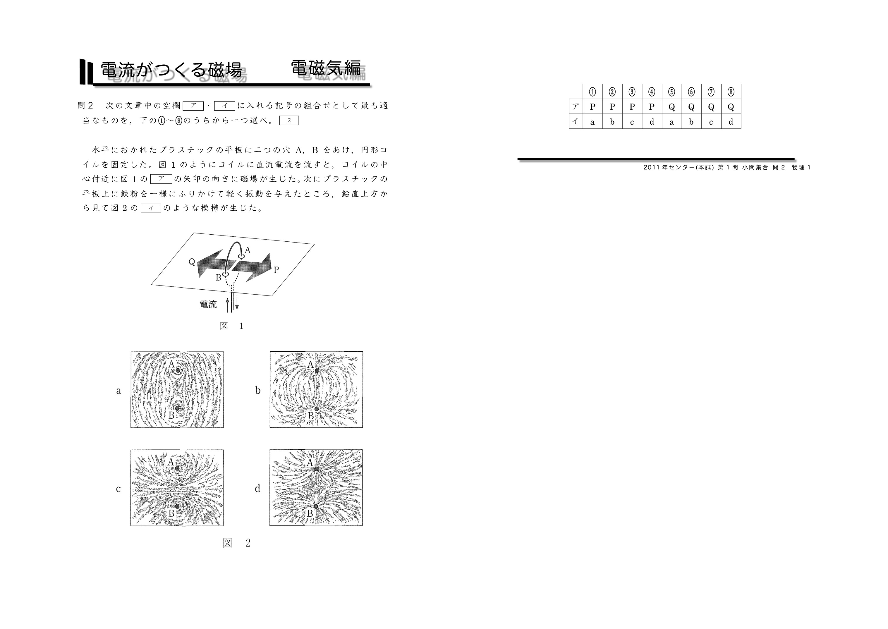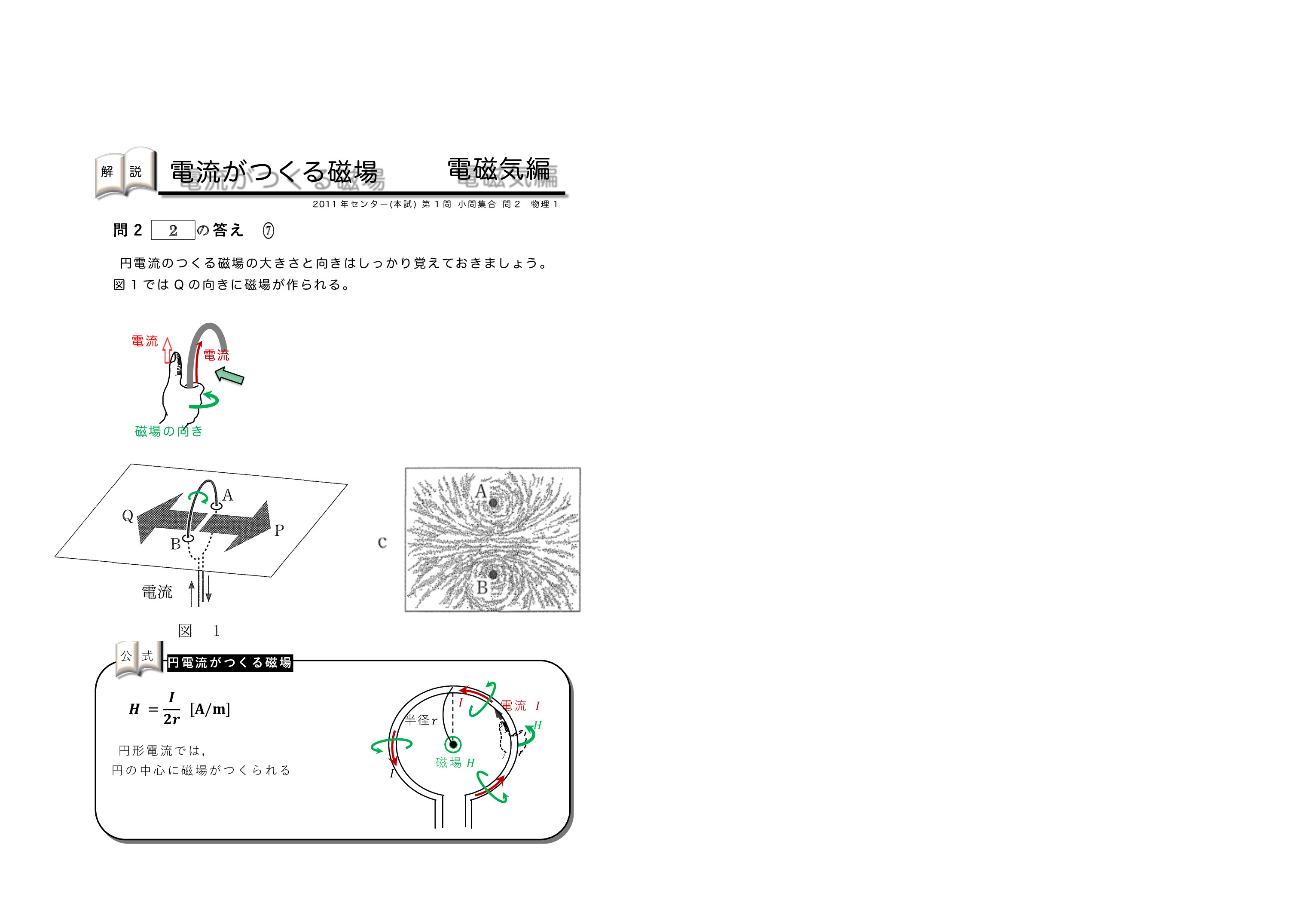| センター試験の過去問を使った共通テスト対策になります。左から右へ順にグリーン→オレンジ→ブルーの順番に問題を解いていくと学習効果が上がるように作成しています。問題を解いた後に解説ページで知識の確認をしていくとよいです。電流がつくる磁場の公式は3つです。しっかり覚えましょう。がんばれ♪ | ||