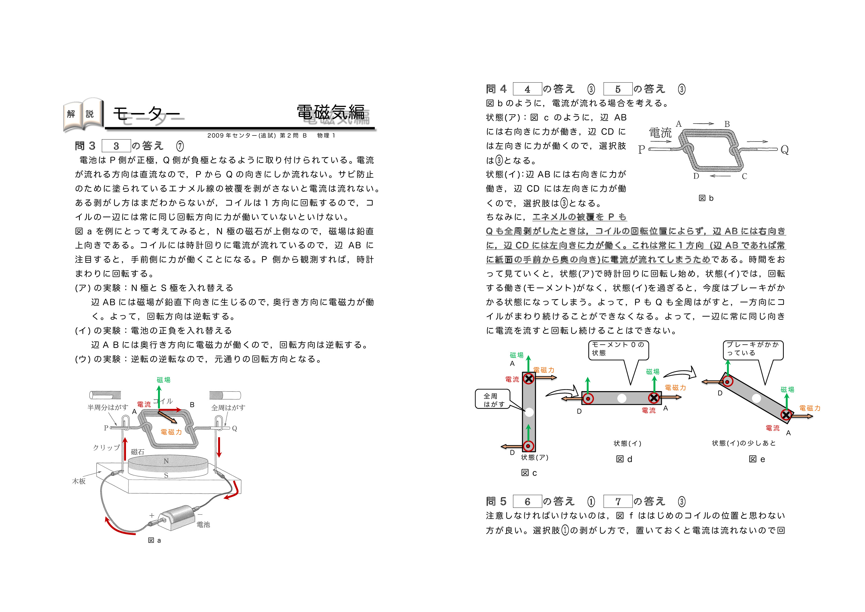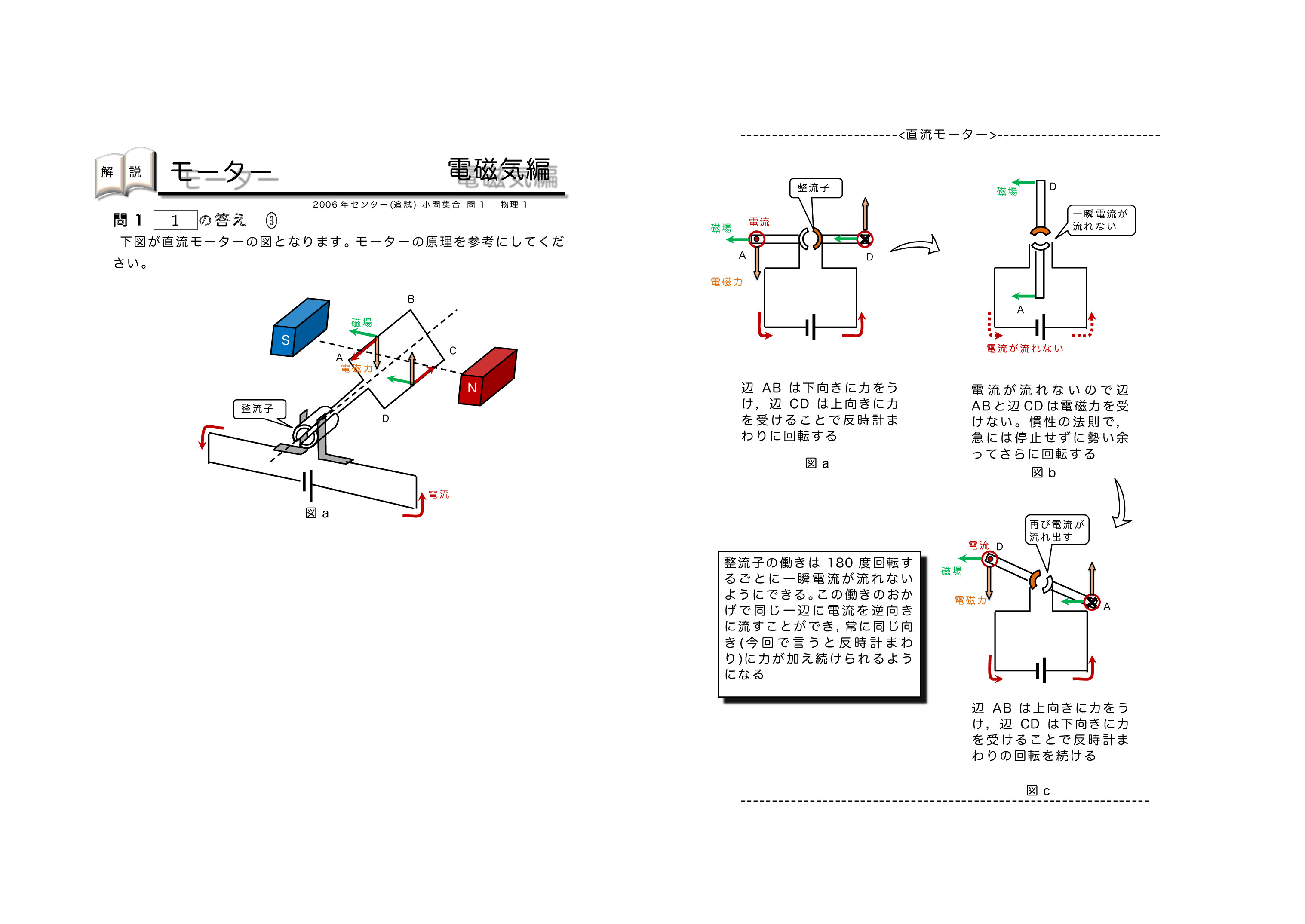| センター試験の過去問を使った共通テスト対策になります。左から右へ順にグリーン→オレンジ→ブルーの順番に問題を解いていくと学習効果が上がるように作成しています。問題を解いた後に解説ページで知識の確認をしていくとよいです。モーターの仕組みがわかるようになります。モーターを理解することで発電機の理解も深まります。頑張れ♪ | ||