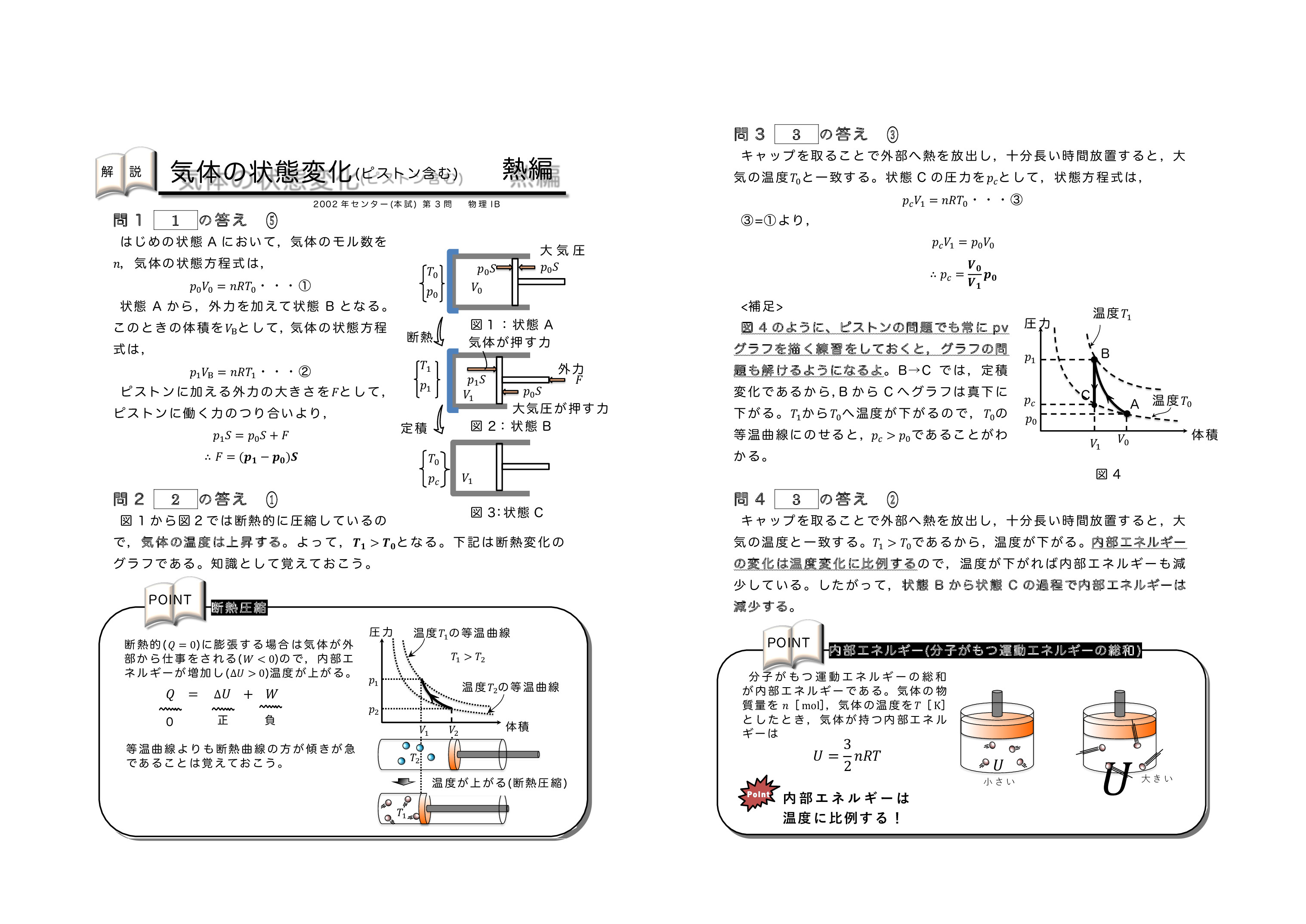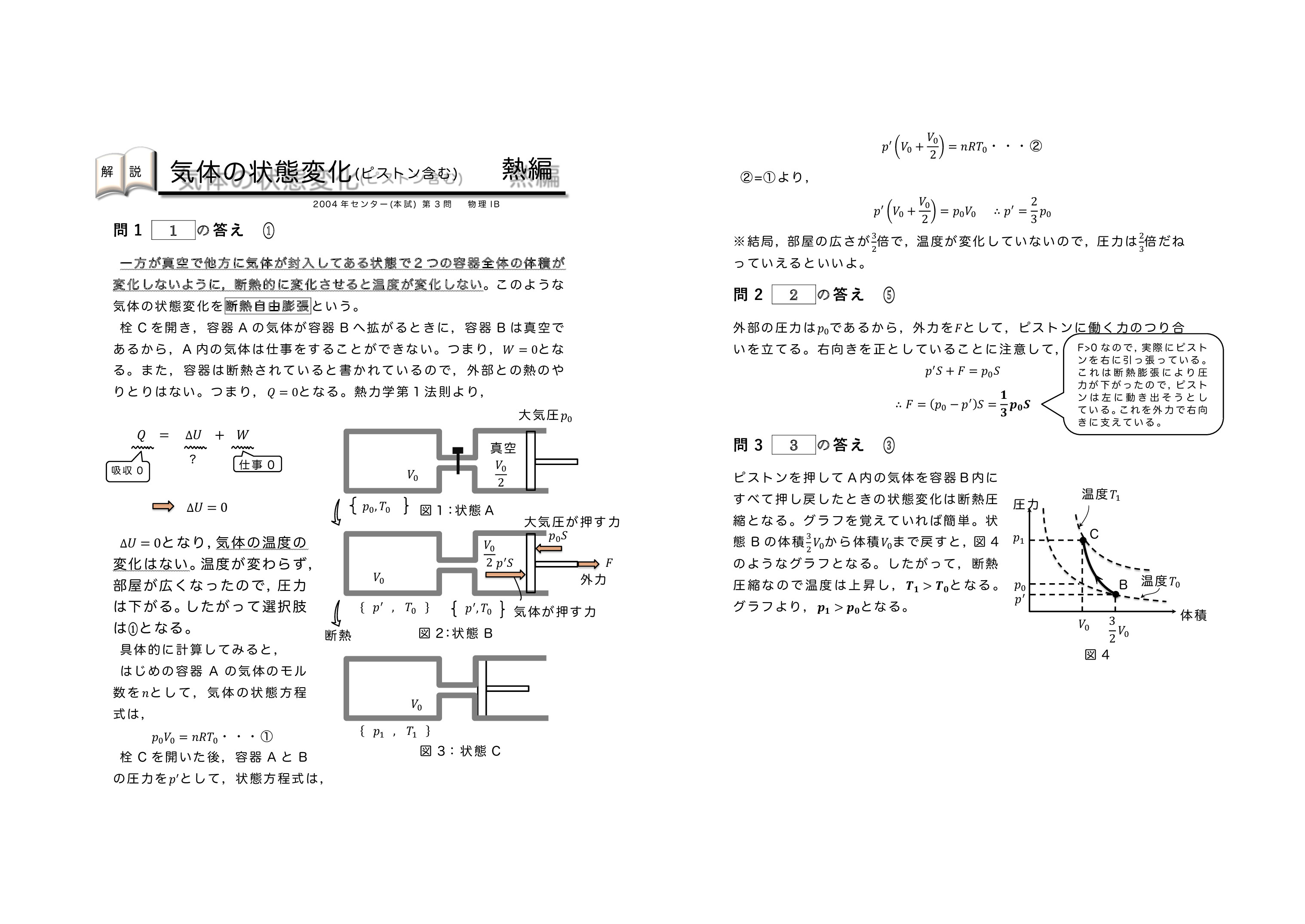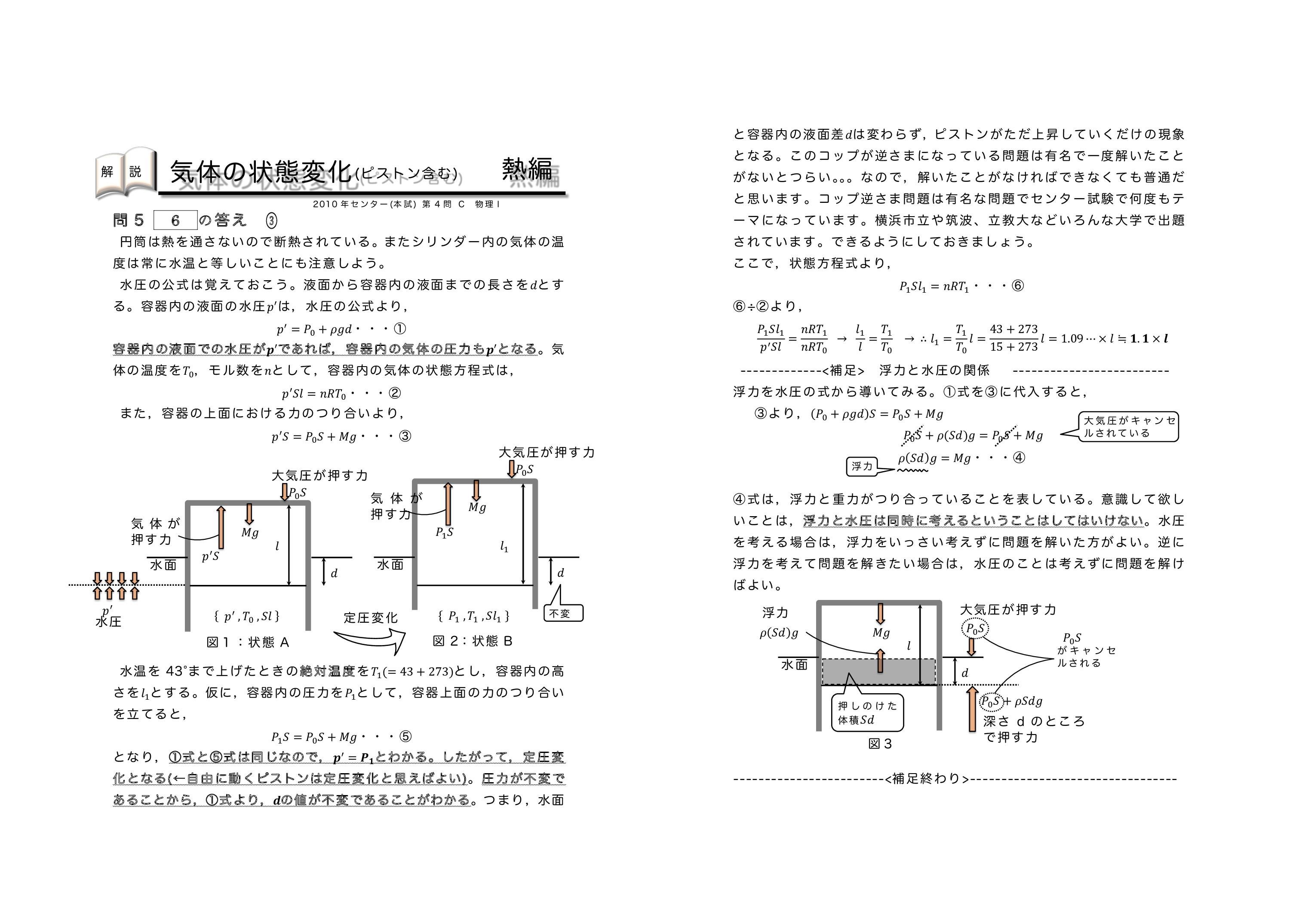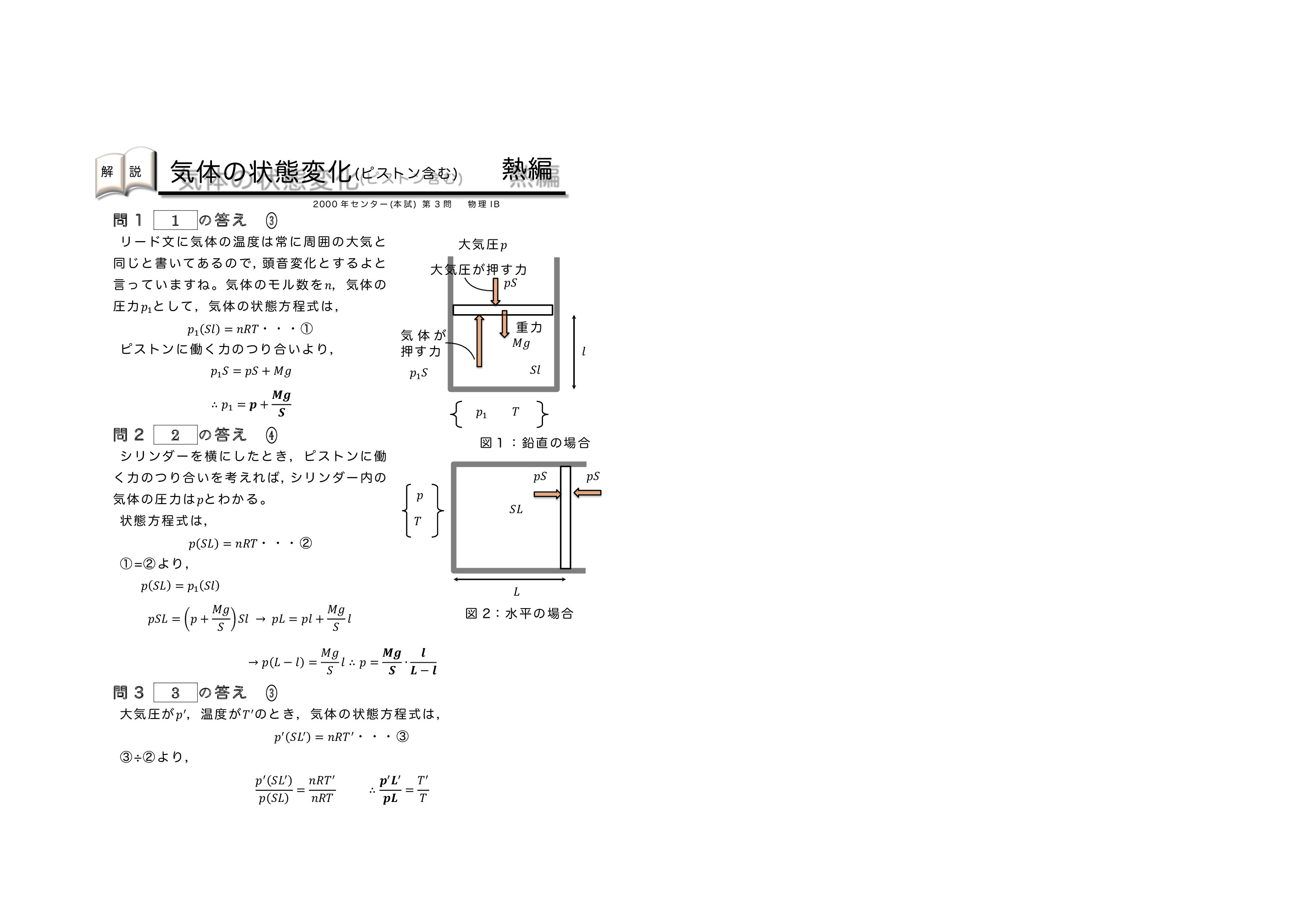 | 【 熱力学編 気体の状態変化(ピストンを含む) 】 | ||